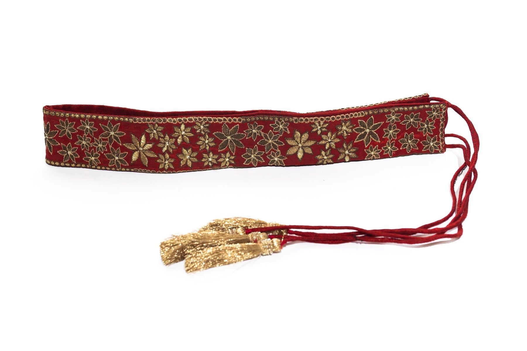 Adorn your ensemble with this sumptuous gold silk waist belt on maroon fabric. Incorporated resham work details adorn this piece, perfect for weddings, receptions, navratri, parties and other formal events.