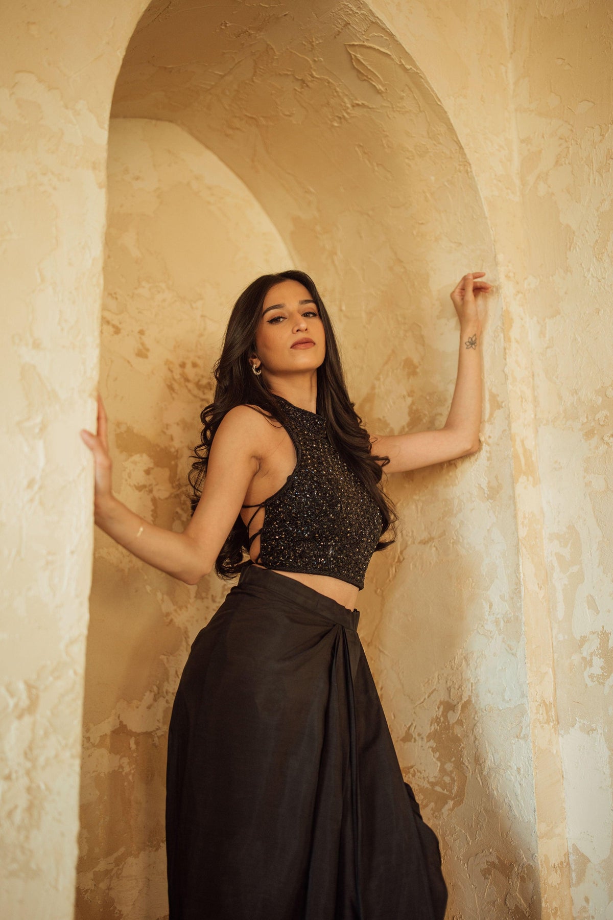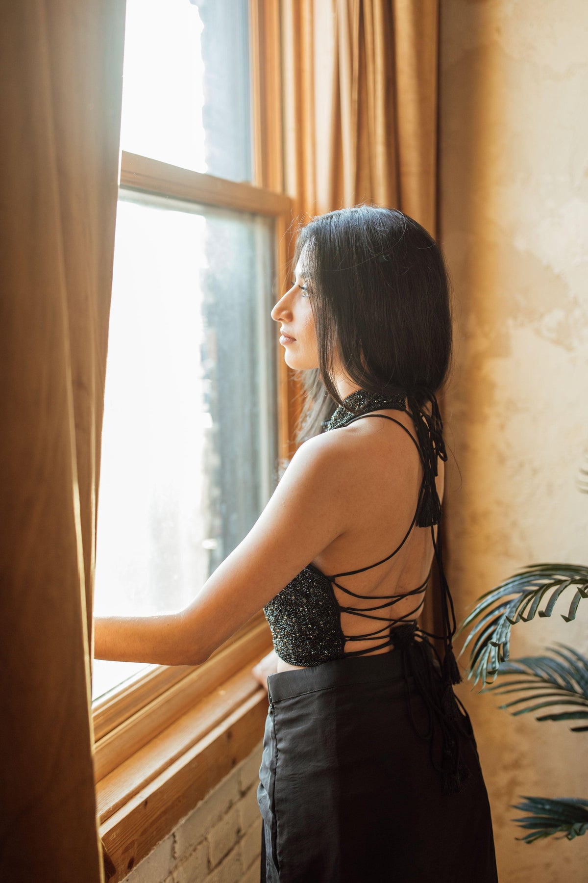 Introducing our Giada Top - the perfect addition to your wardrobe. This versatile, black beaded high neck top offers a touch of elegance and sophistication, while the lace-up back adds a touch of intrigue. It’s made of soft silk that feels beautiful against the skin. With its flattering fit and attention to detail, this top is sure to make a statement wherever you go.