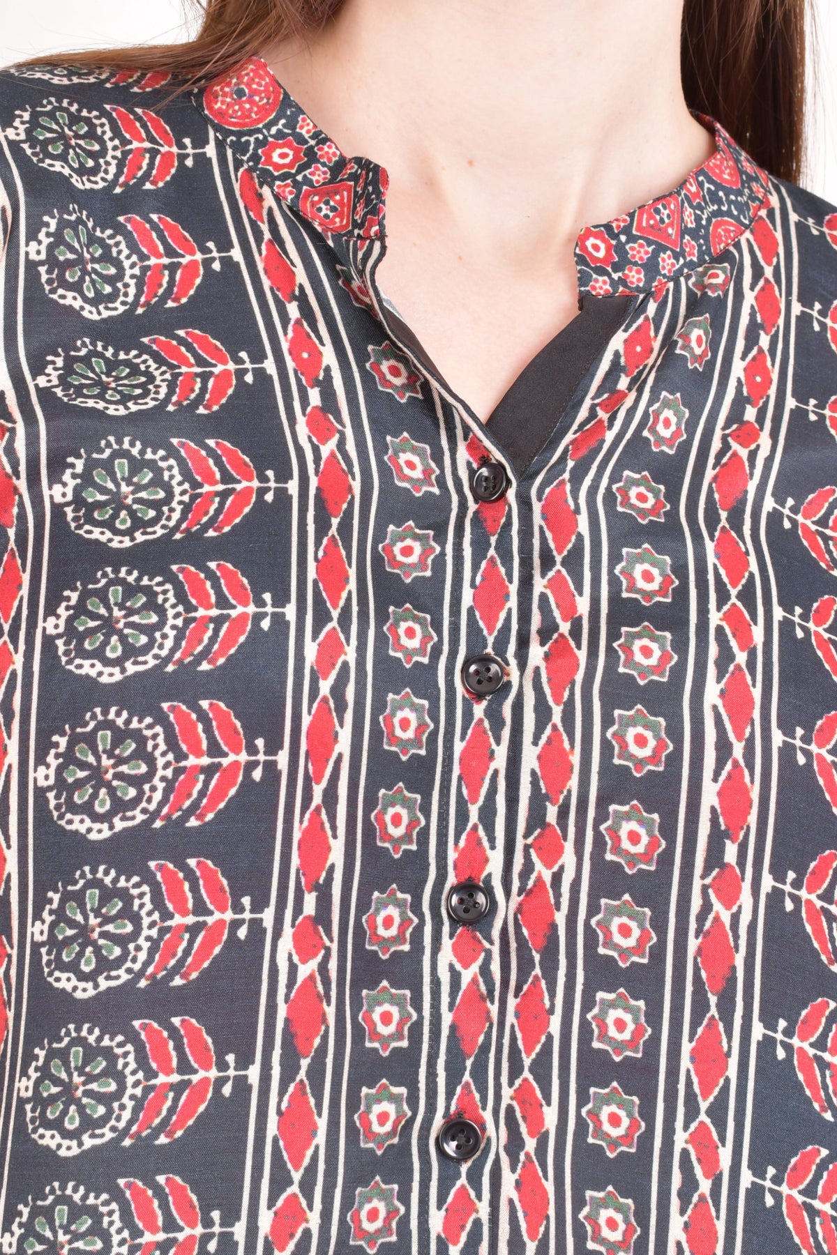 Crafted from soft muslin silk, this button-up top features an all-over Ajrakh print in a striking maroon and black color palette. Its rich tones and breathable fabric make it a versatile piece for casual days or dressed-up evenings.