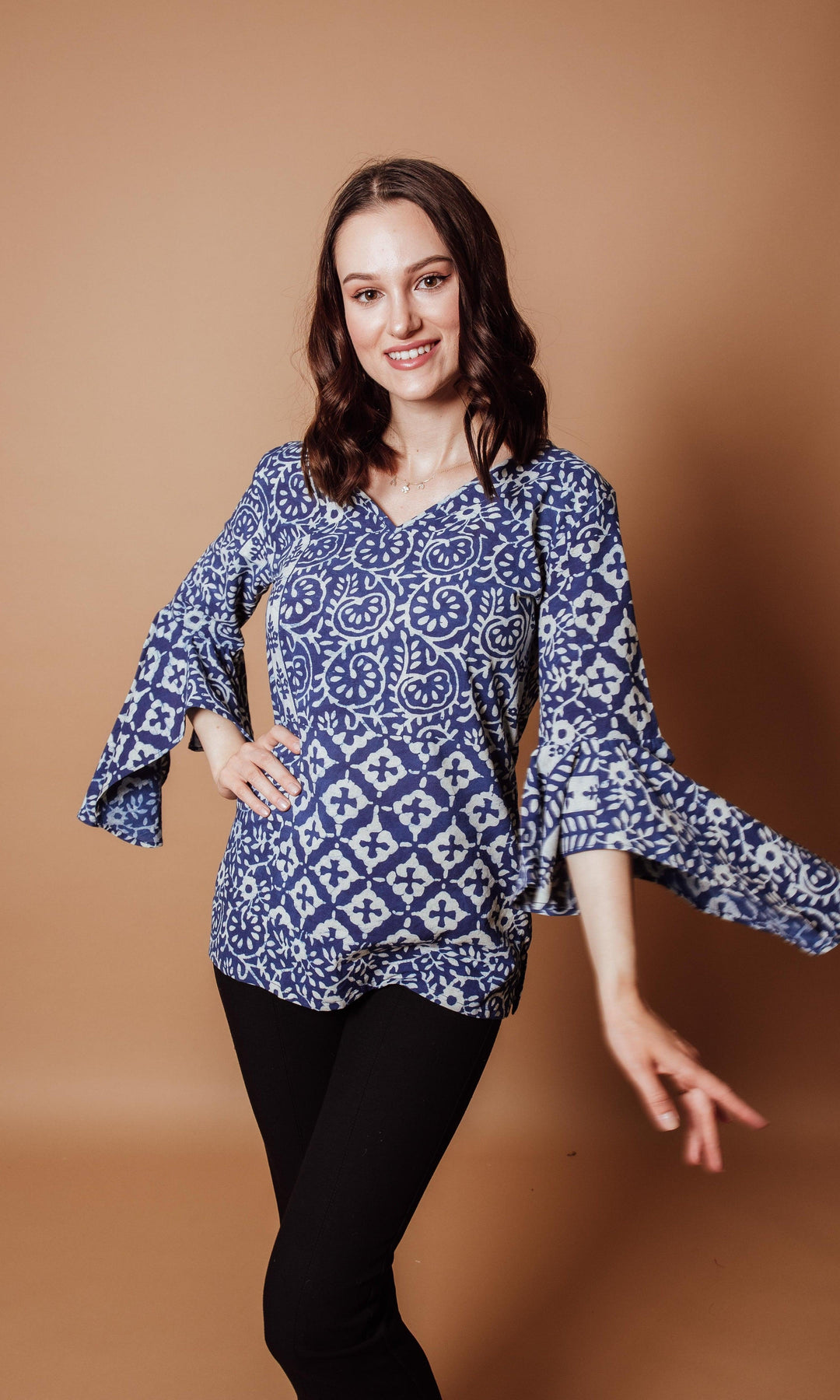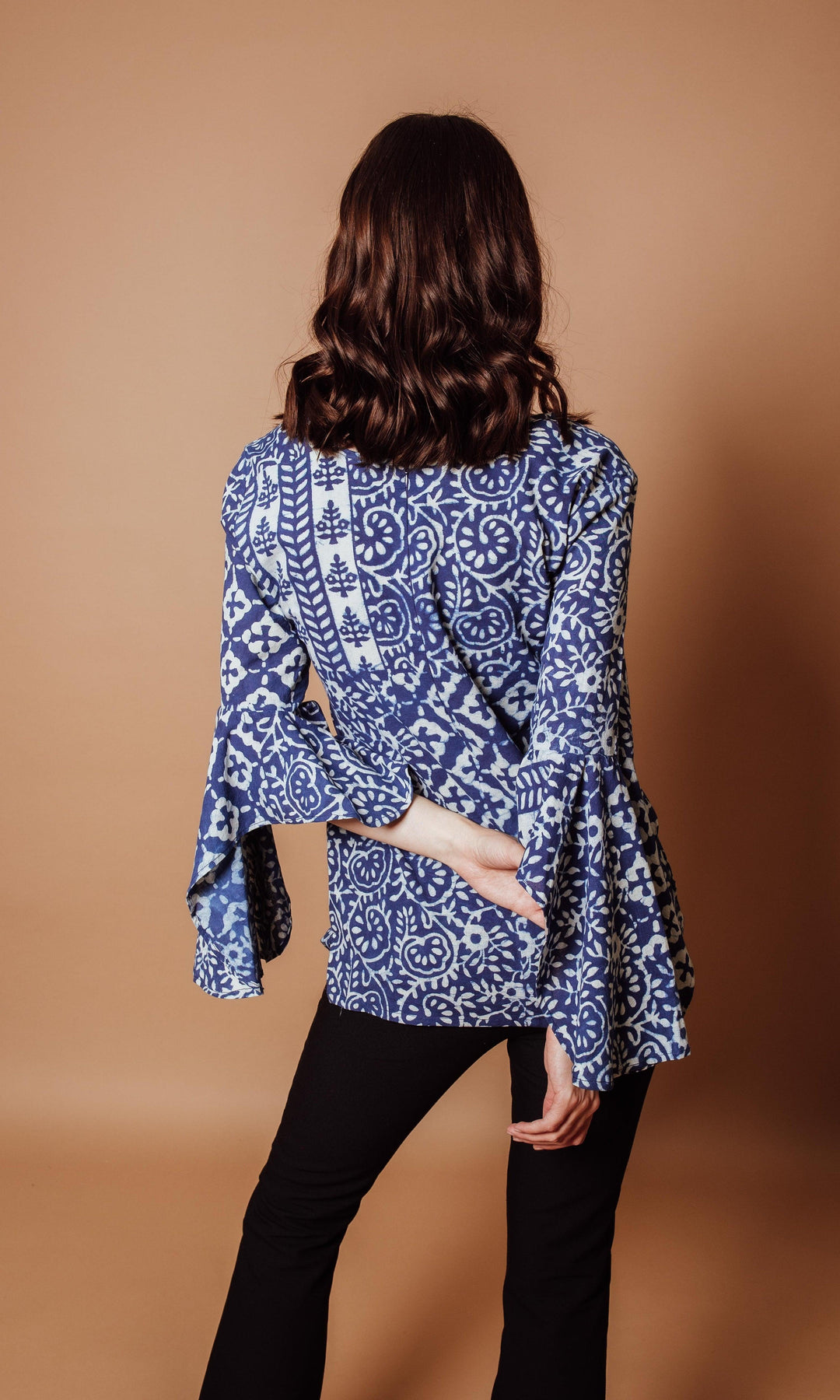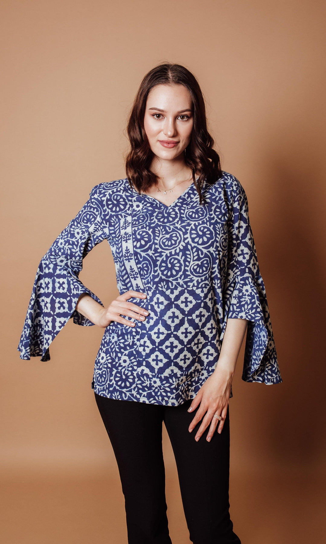 This Regular Fit, cotton, hand block printed Straight Style V Neck Top with thoughtfully placed ruffle sleeves is designed to highlight your natural curves while creating an elegant and timeless silhouette sure to garner attention.