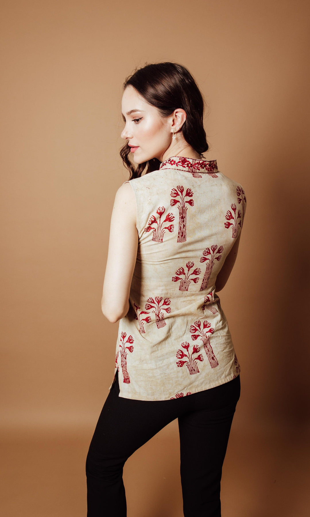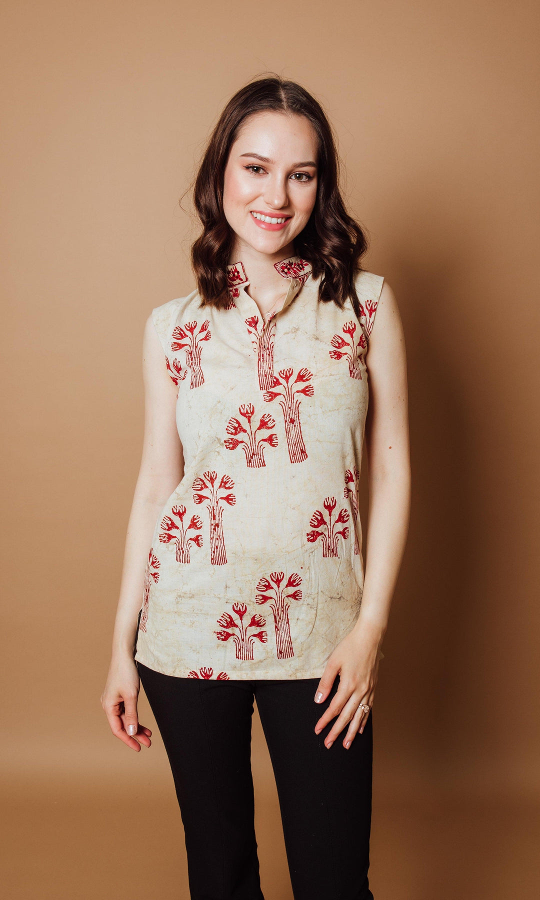 - Specifications: Regular fit, high neck, sleeveless, embroidered neckline, all-over hand-block dhabu print
