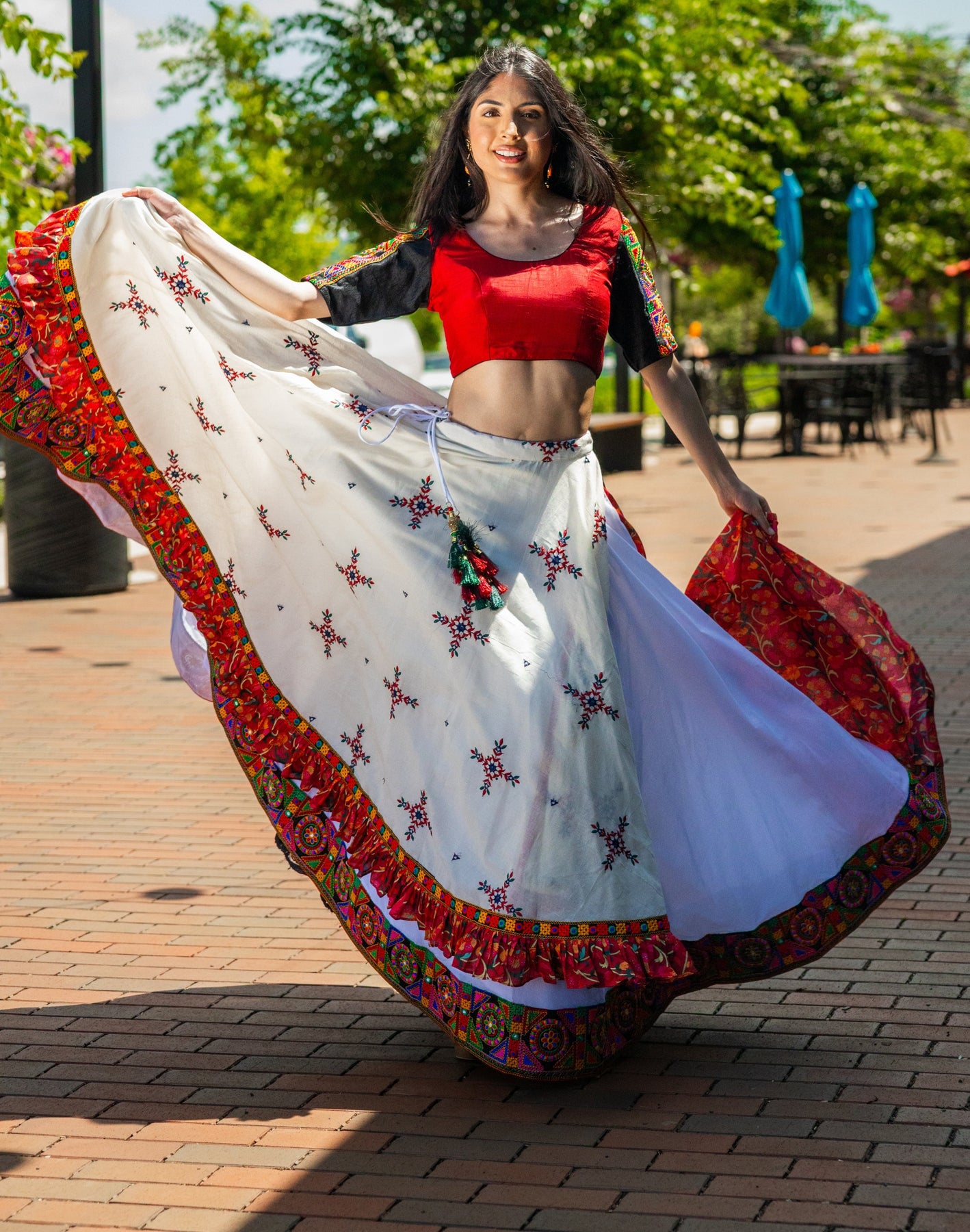 Rooted in tradition with striking details, the Full Flare Layered Chaniya Choli is designed to make a statement. The silk layered chaniya features a resham-embroidered outer layer, finished with a Kutchi-embroidered hem that matches the detailing on the blouse sleeves. The bold red blouse is accented with signature Kutchi embroidery on the sleeves, while the black georgette dupatta adds contrast with intricate all-over resham embroidery. This three-piece set is perfect for Garba nights and festive celebrations where every detail counts.