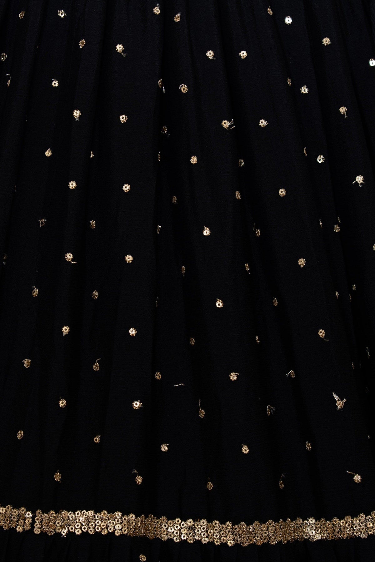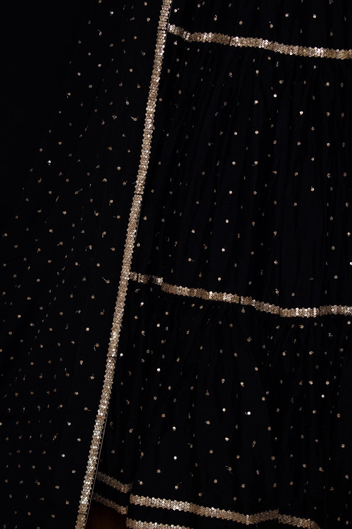 Make a striking impression with this black full flare tier lehenga, crafted from luxurious chinon fabric. The design features intricate zardosi work and sequins on the lehenga, adding a rich texture and elegant shimmer. Paired with a velvet one-shoulder blouse, this ensemble is perfect for any special occasion, including parties, mehndi, and events where you want to stand out. The lehenga is complemented by a contrasting dupatta to complete this captivating look.