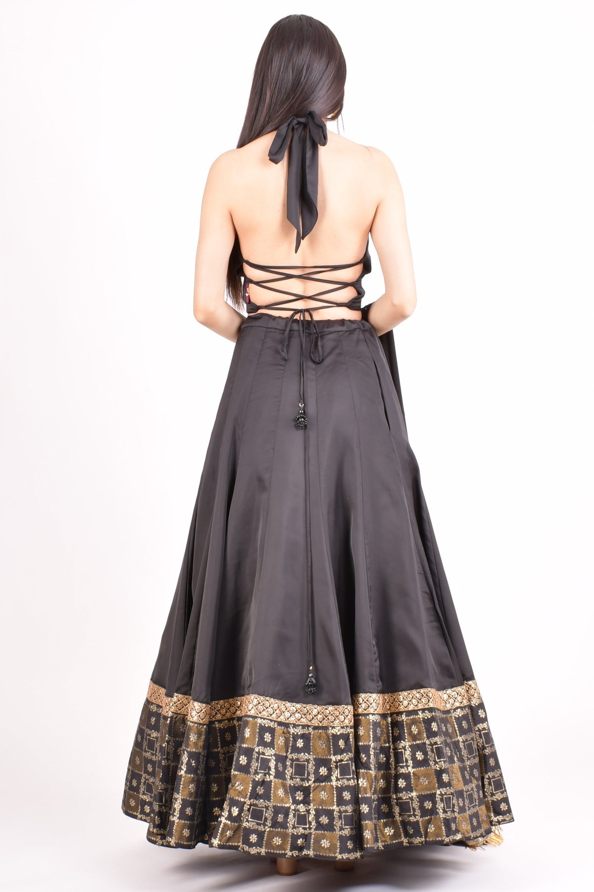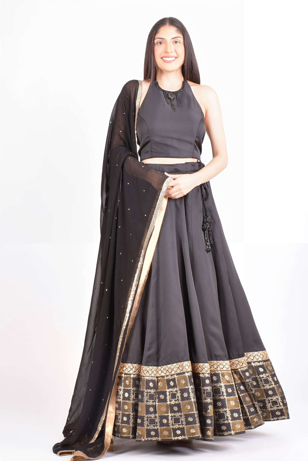 Chic, timeless, and effortlessly bold — the Tara Black Lehenga Choli redefines classic elegance. Crafted from soft black modal silk, the lehenga features a striking gold and black border with a jacquard hem for added texture and depth. The matching blouse is subtly elevated with delicate crystal embellishments, bringing a hint of shimmer. A flowy georgette dupatta completes the lehenga choli set, making it perfect for evening festivities and formal celebrations.