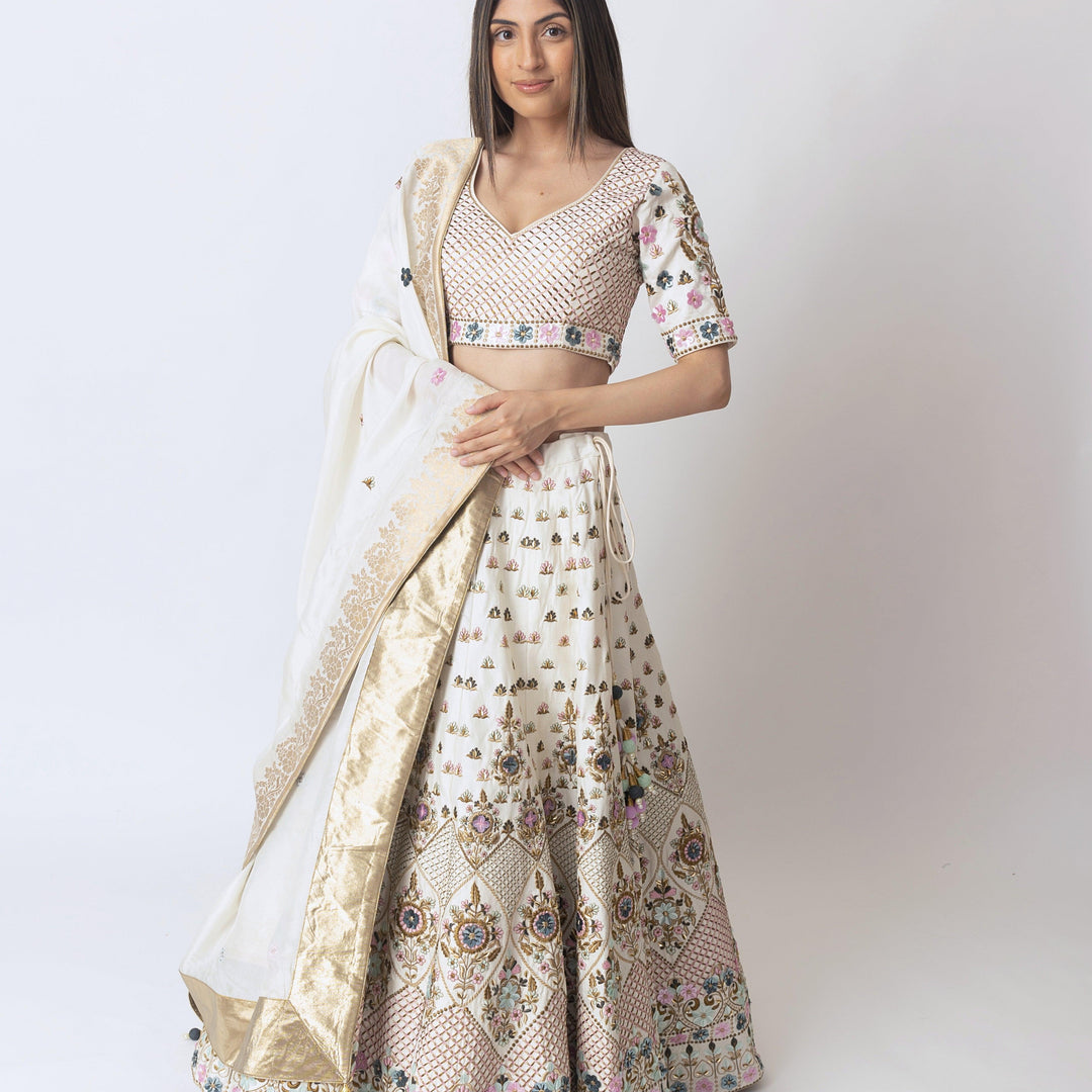 The Siddhi White Raw Silk Lehenga Choli is an elegant and luxurious piece, showcasing intricate stone and resham hand embroidery, with an embroidered blouse and matching dupatta. The jewel details on the blouse enhance its regal appeal, making it a perfect choice for special occasions such as weddings or formal events.
