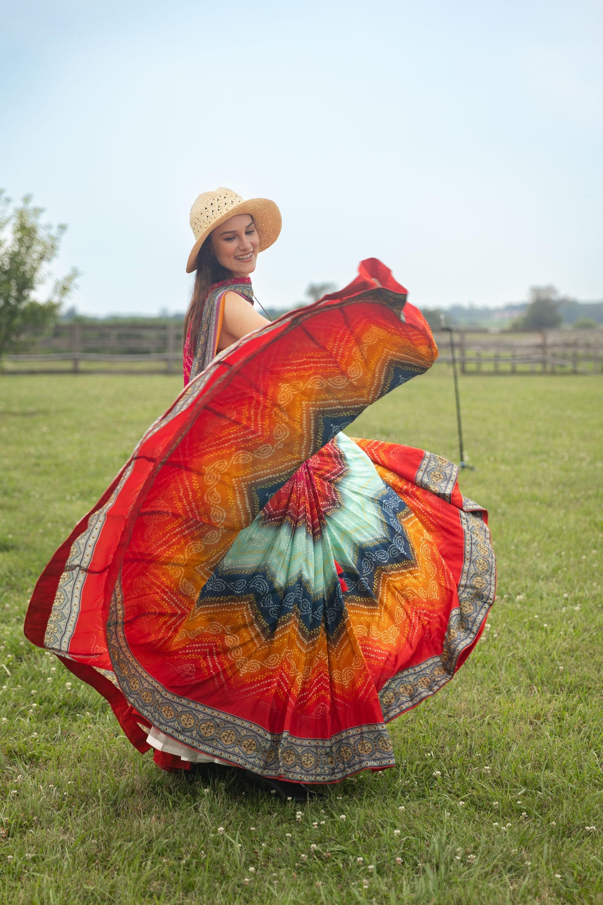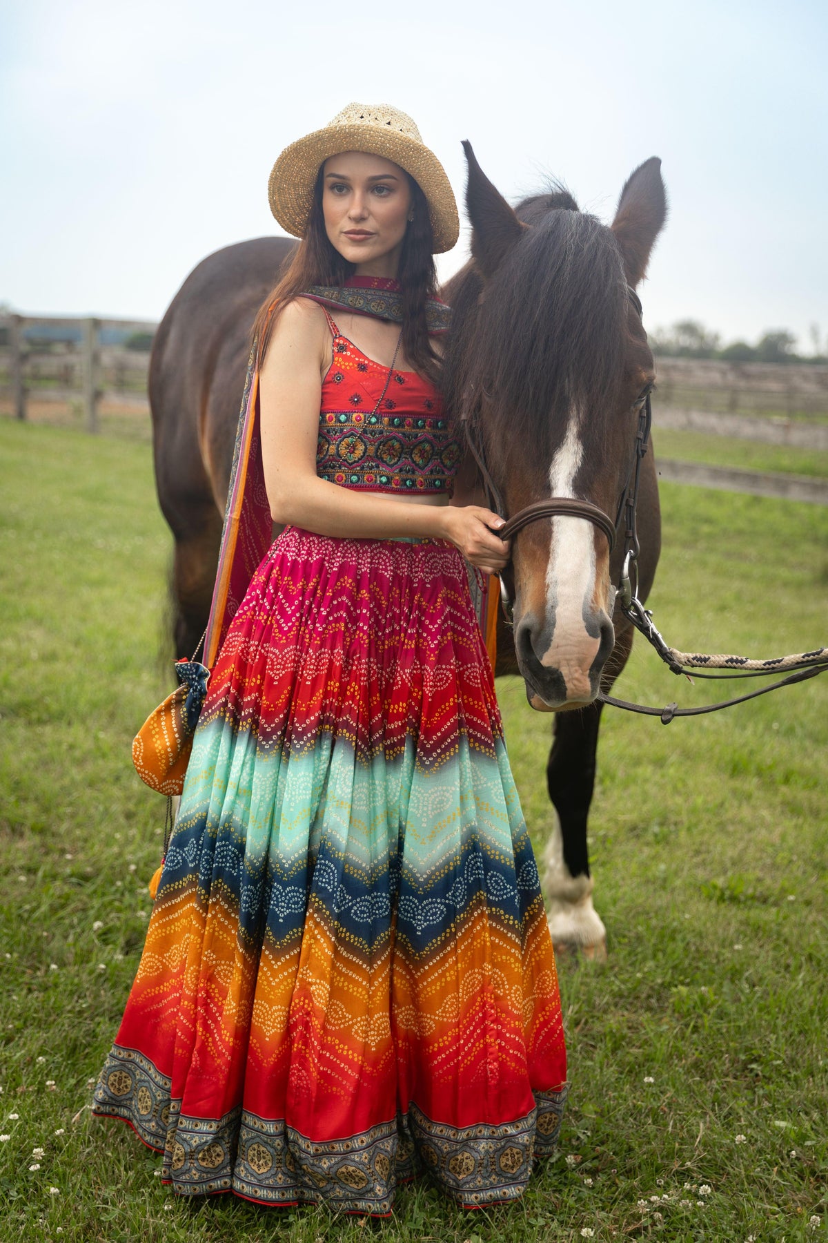 The Destiny Multicolor Lehenga Choli, part of our Untamed Collection, is a vibrant celebration of individuality and self-expression. The silk lehenga features exquisite bandhani prints in a cascade of vivid hues, flowing gracefully from top to bottom. The silk blouse is adorned with intricate embroidery and embellishments, adding a touch of elegance and artistry. Completing Destiny Lehenga Choli Set is a georgette dupatta which showcases bandhani patterns that mirror the lehenga’s design to perfectly tie the look together. The Destiny Lehenga Choli Set is a true statement of creative expression and perfect for those who love playing with colors and embracing their bold, authentic selves.