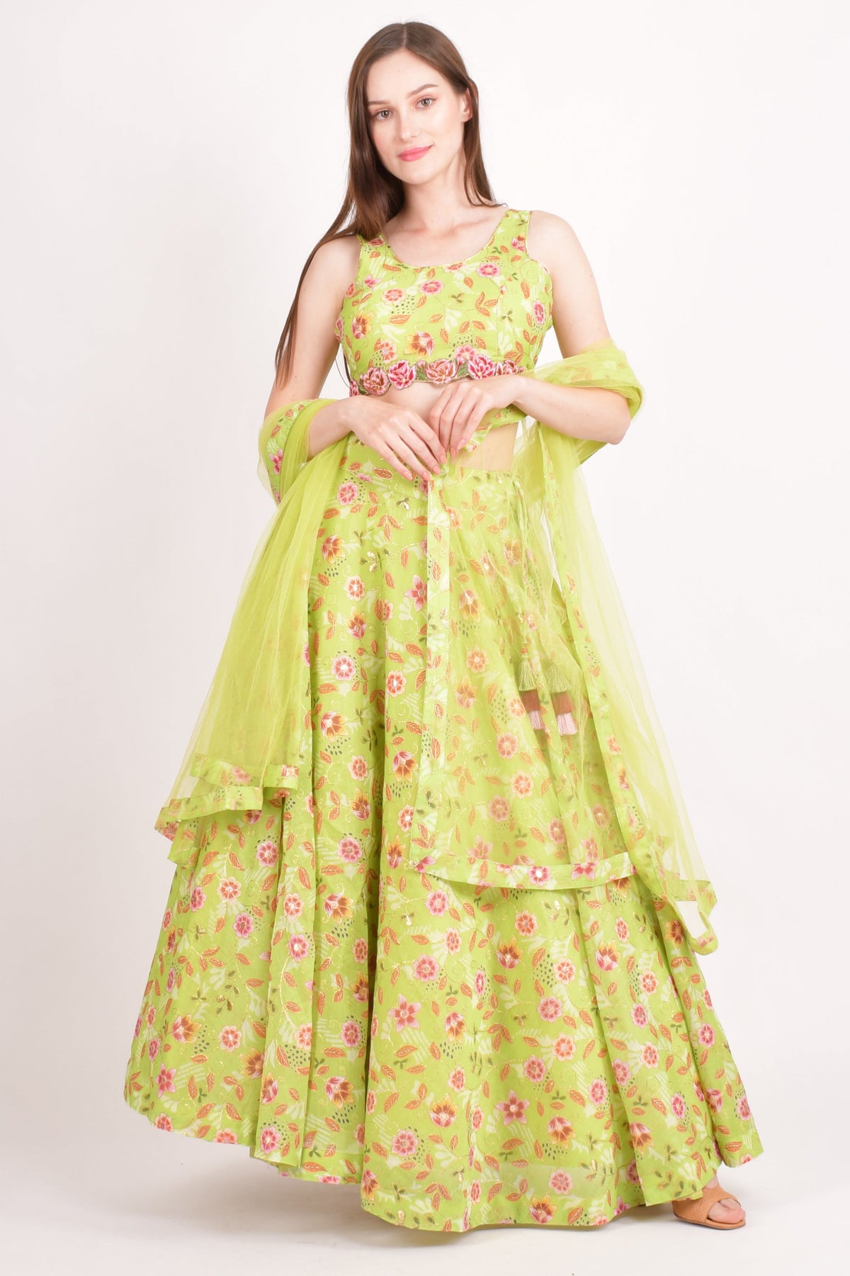• Fabric: Silk blend (Lehenga & Blouse), Net (Dupatta)