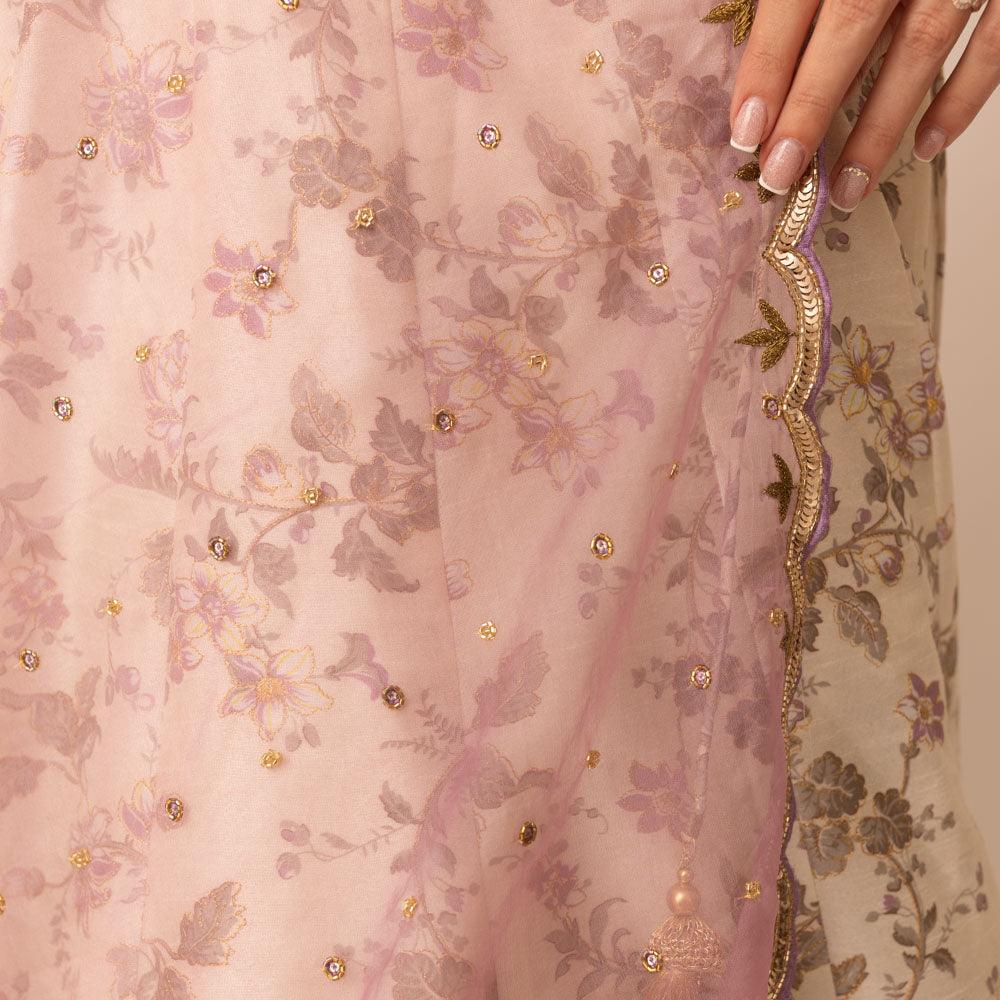 The Off White Floral Silk 3-piece set offers a beautiful blend of elegance and tradition. Featuring floral cutout details on the neckline, adorned with mirror and beadwork, this set adds a unique touch to any occasion. The soft silk fabric and intricate embroidery make it a sophisticated choice for weddings, receptions, or festive events.