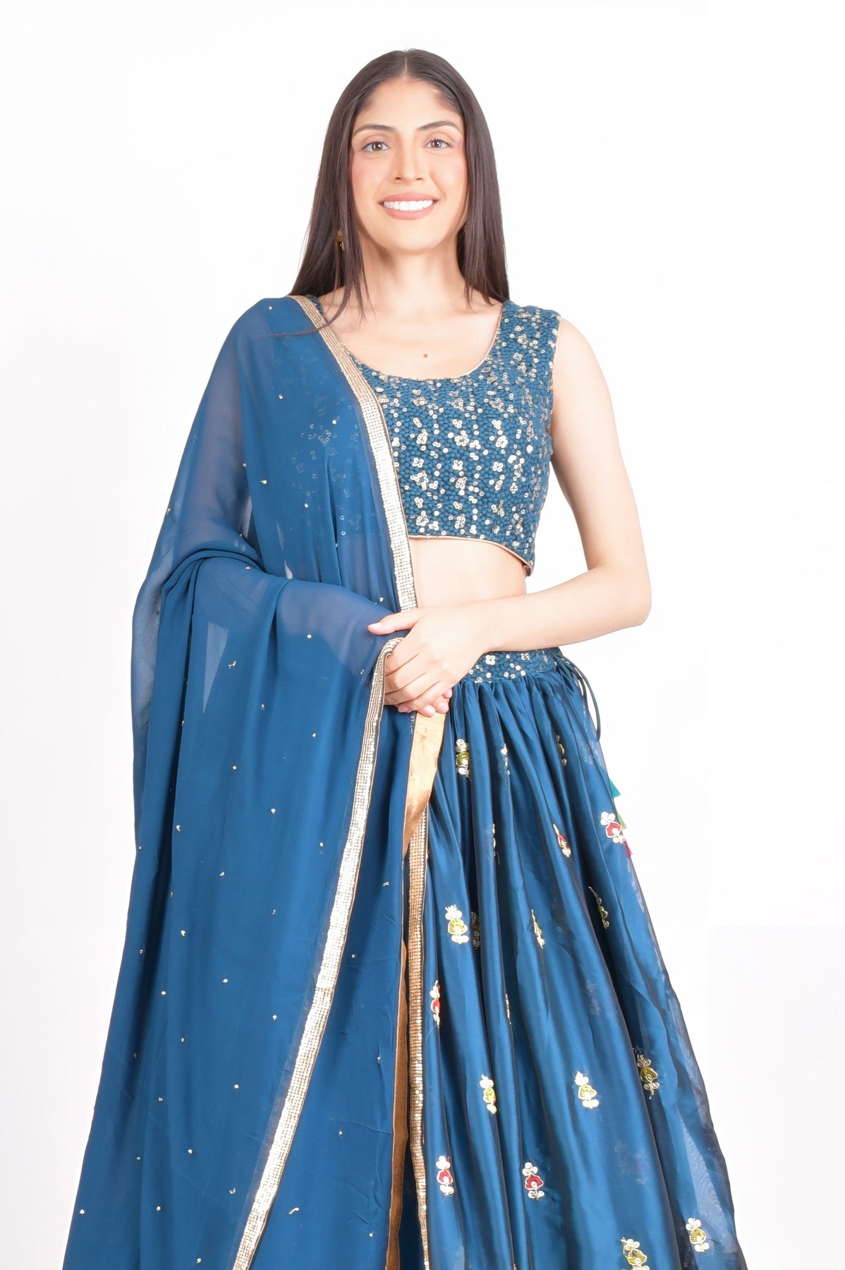 Make a statement at your next celebration in the Sequins Teal Blue Lehenga Choli with Embroidery. Crafted from a luxurious silk blend, the sleeveless blouse is covered in intricate sequin and floral embroidery, while the lehenga skirt features vibrant multicolor peacock motifs that cascade gracefully along the hem. The rich teal hue lends a regal, eye-catching quality to this stunning set — an ideal choice for weddings, sangeet nights, and festive celebrations.