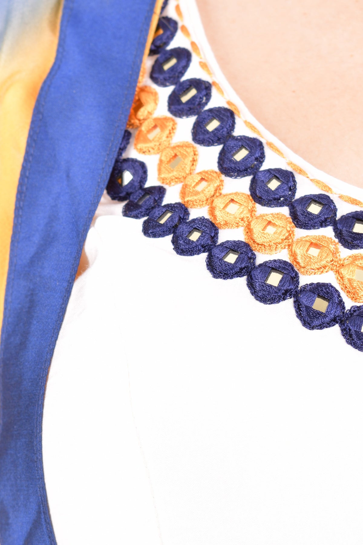 Bright, festive, and made for movement — the Aanya Garba Lehenga Choli brings the spirit of Navratri to life. The blue and orange printed silk blend lehenga bursts with energy, perfectly balanced by a white mirror-embroidered silk blouse that reflects the light with every twirl. Finished with a georgette shaded dupatta adorned in mirror work, this set is a radiant pick for Garba nights and cultural celebrations.