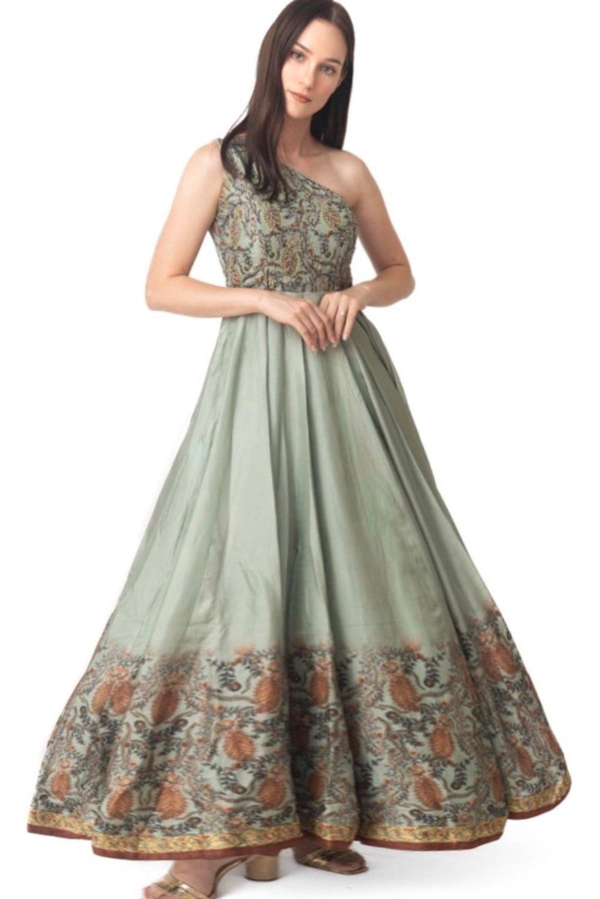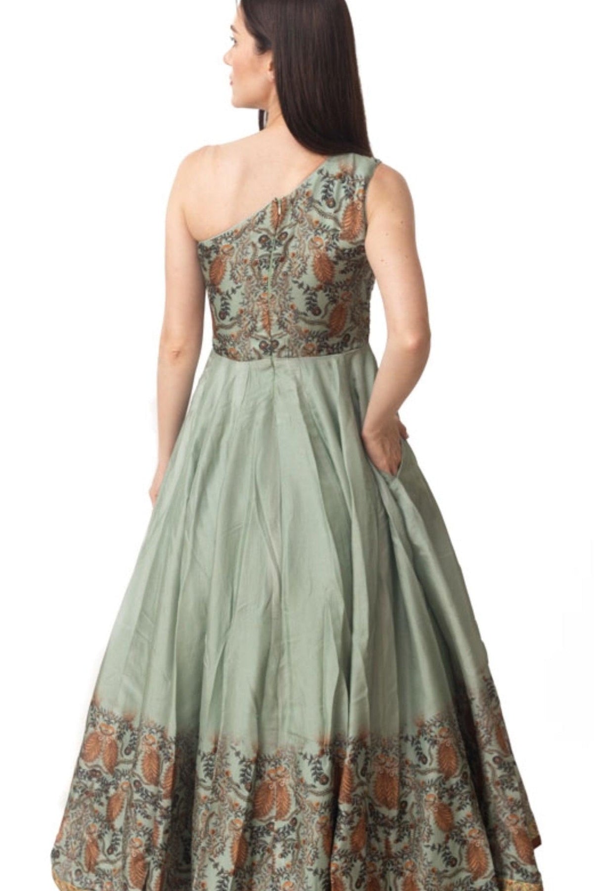 This stunning One Shoulder Dress flaunts a printed silk gown with hand embroidered torso. This green one shoulder dress, with a fit & flare silhouette, is perfect for special occasions, festive events, parties, wedding functions, or engagement ceremonies.