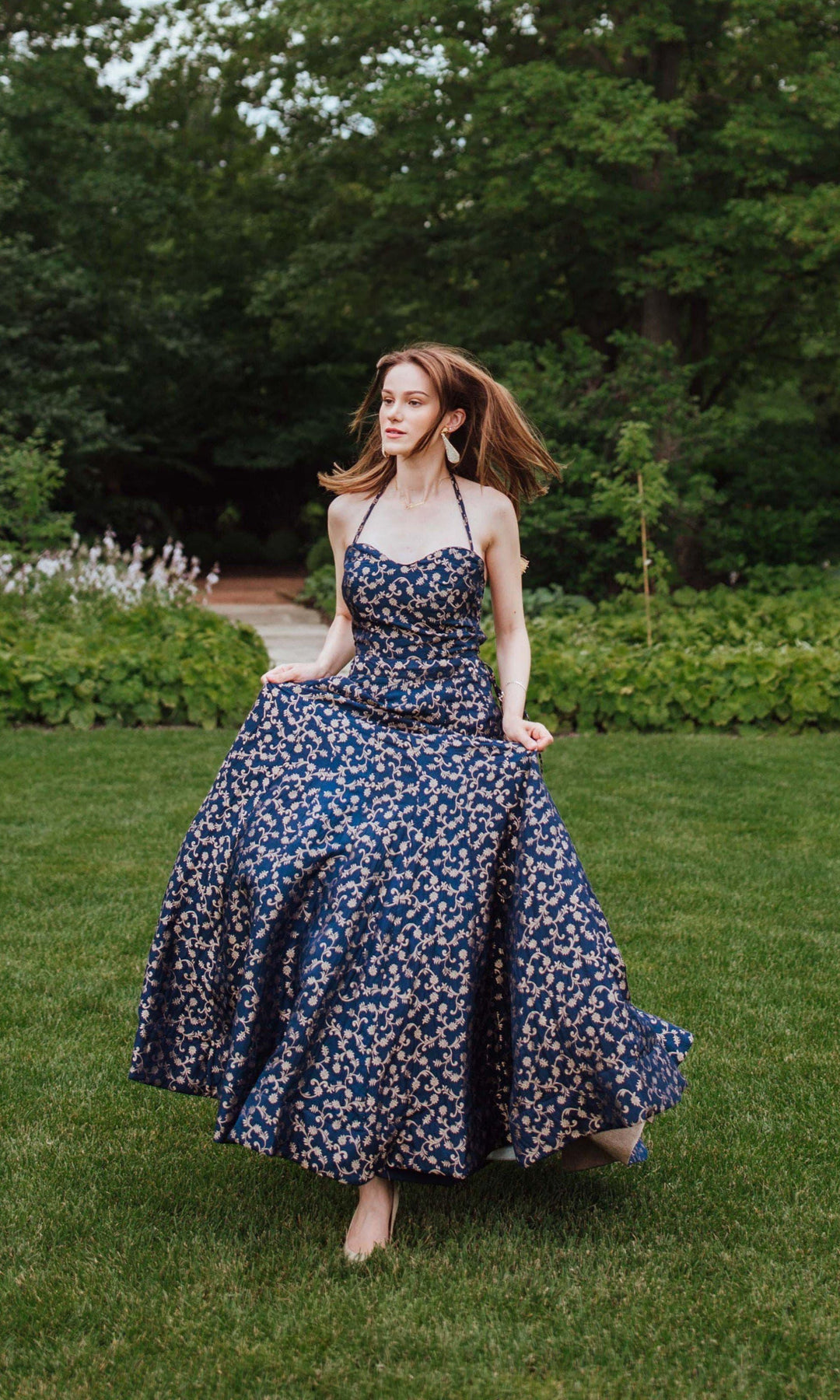 This Blue Gown showcases timeless elegance with its rich blue hue and luxurious silk fabric. Featuring intricate all-over brocade weaving, this A-line dress flares gracefully from the waist to create a stunning flowy effect. Its versatile, convertible design allows you to style it as a halter dress with the provided string or wear it off-shoulder, offering flexibility for any occasion.