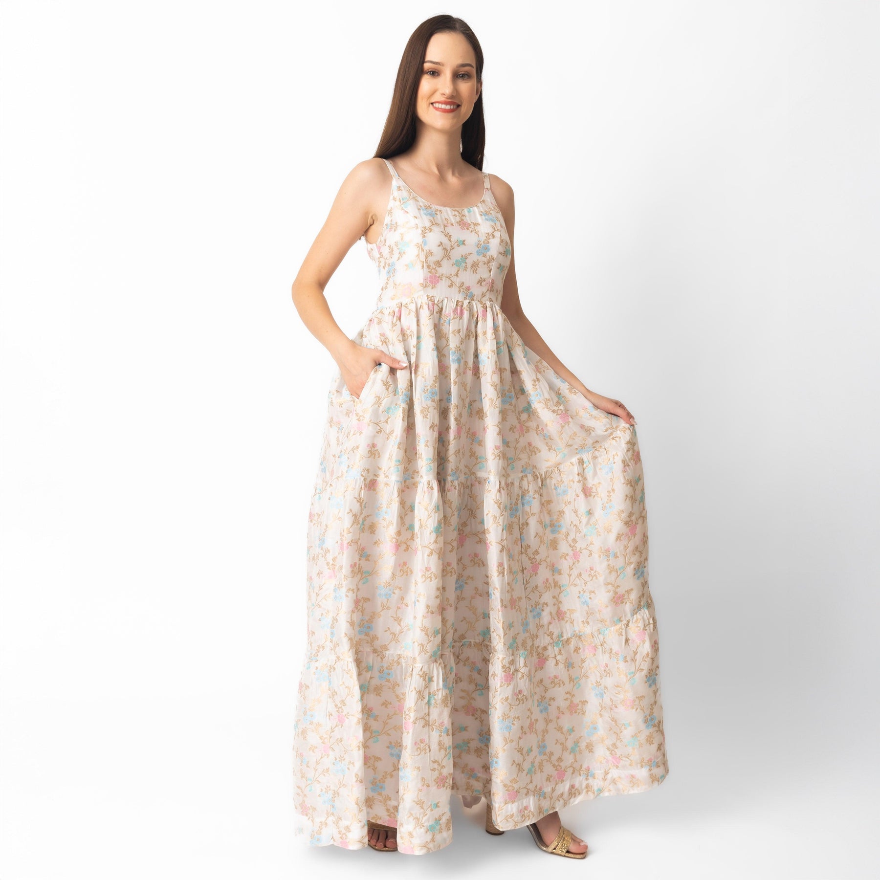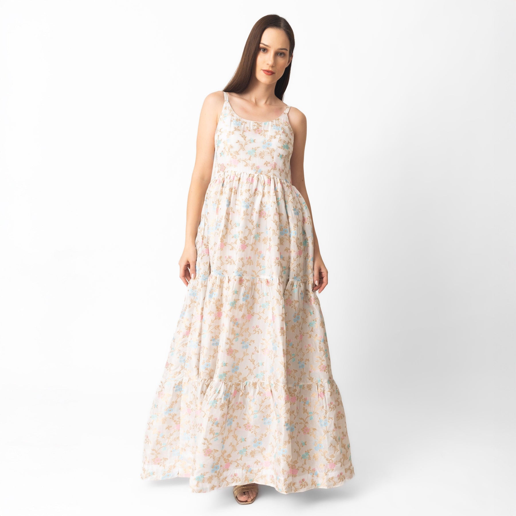 The Tierney Tiered Floral Dress is a timeless piece that effortlessly combines elegance with understated beauty. Crafted from luxurious silk, this long dress features intricate jacquard weaving all over to create a subtle yet stunning pattern. The scoop neckline enhances the dress’s classic appeal, while the tiered design flows gracefully and makes a refined statement without being overwhelming. The Tierney Tiered Floral Dress is a perfect choice that radiates quiet elegance.