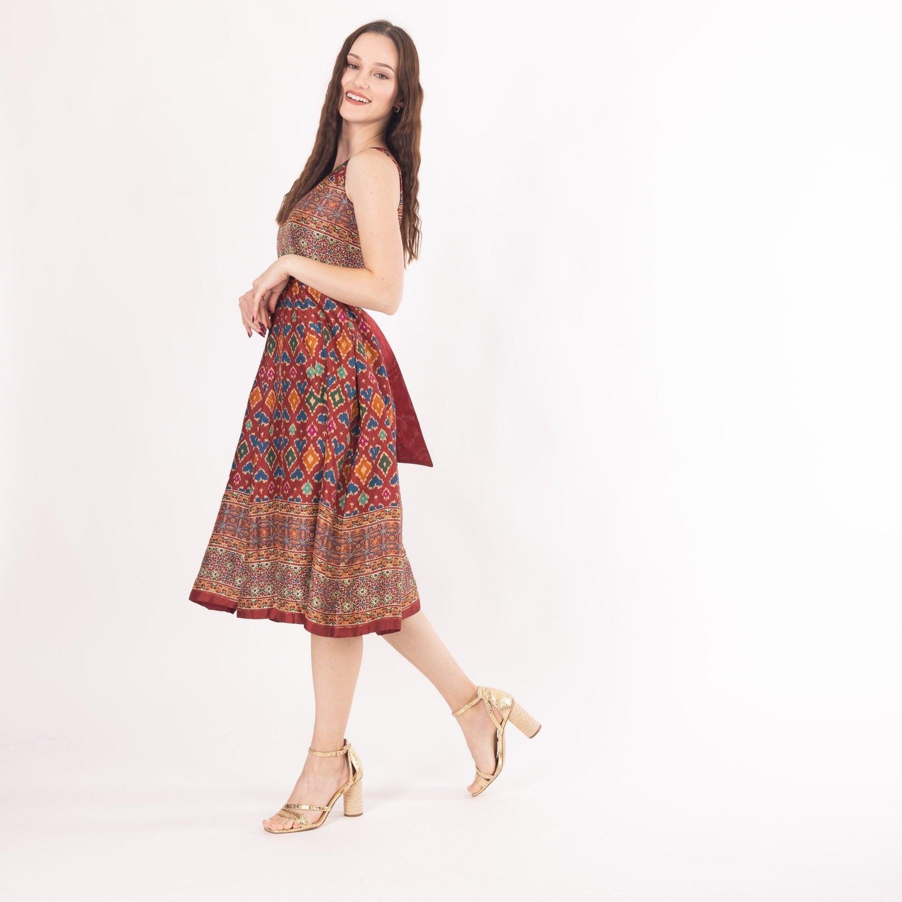 The Sorrel Maroon Midi Dress with Embroidered Belt features a silk dress with a flattering midi silhouette. The midi dress is adorned with an all-over Ajrakh print, while the resham embroidered belt adds intricate detail to the waist to create a stunning focal point. Ideal for both formal and casual occasions, this Maroon Midi Dress ensures you look effortlessly chic anywhere you go.