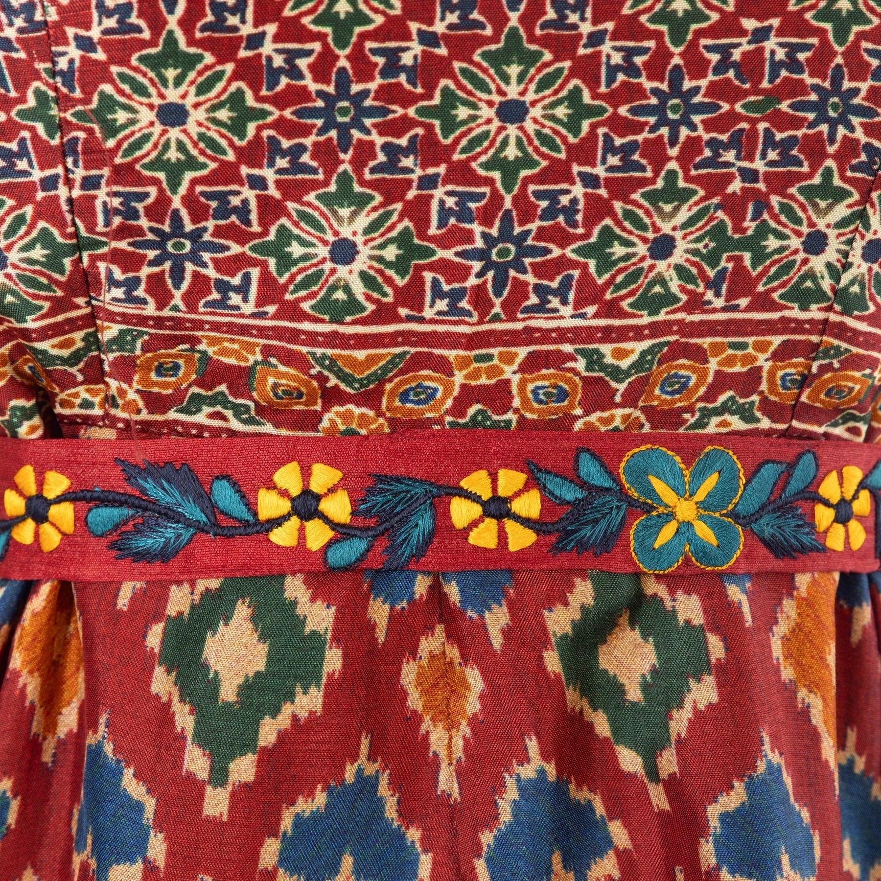 - Specifications: Fully lined, sleeveless, midi silhouette, all-over ajrakh print, closed back with zipper, resham embroidered belt