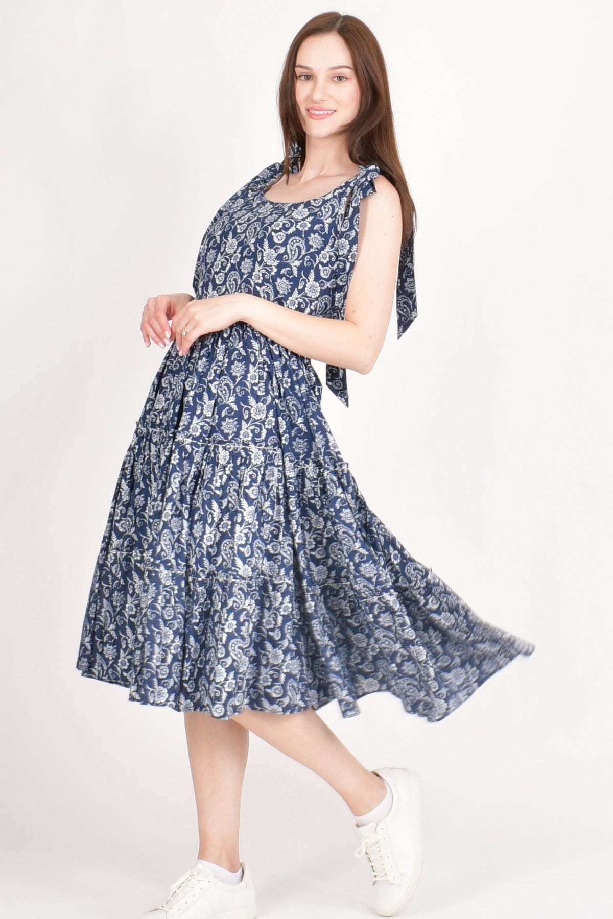 The Mila Blue Tiered Midi Dress exudes effortless charm with its all-over floral printed patterns and flattering fit-and-flare silhouette. It features delicate tiered layers and chic bow-tie shoulder straps for added charm. The Mila Blue Tiered Midi Dress is perfect for a relaxed day out in summer.