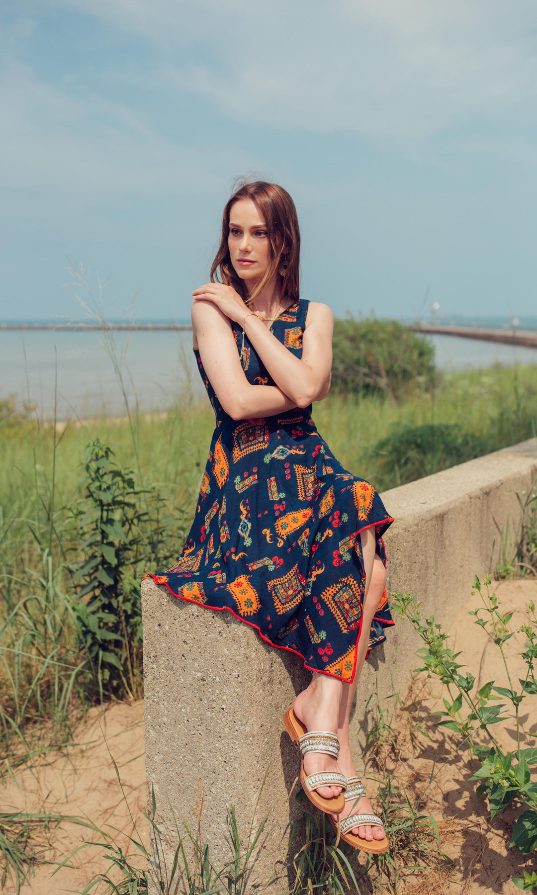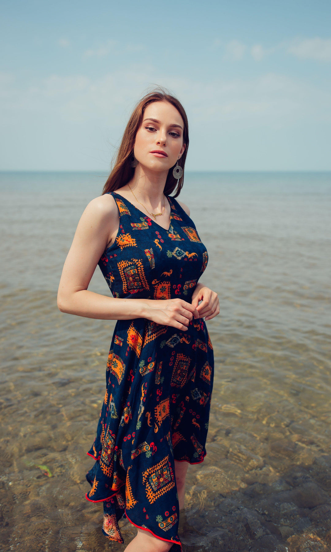 The Millicent Navy High Low Dress, crafted from luxurious viscose rayon, features all-over beautiful patterns that create an eye-catching effect. The V-neckline adds a touch of sophistication, while the high-low silhouette offers graceful movement. Perfect for a day at the beach or warm days, The Millicent Navy High Low Dress combines style with comfort.