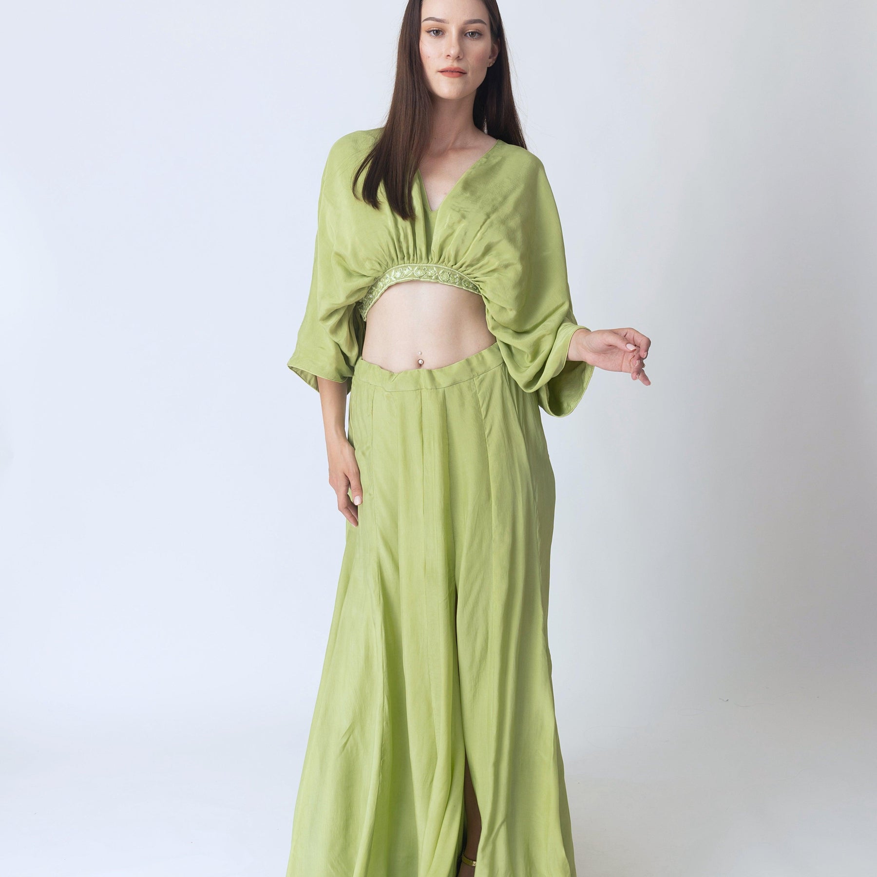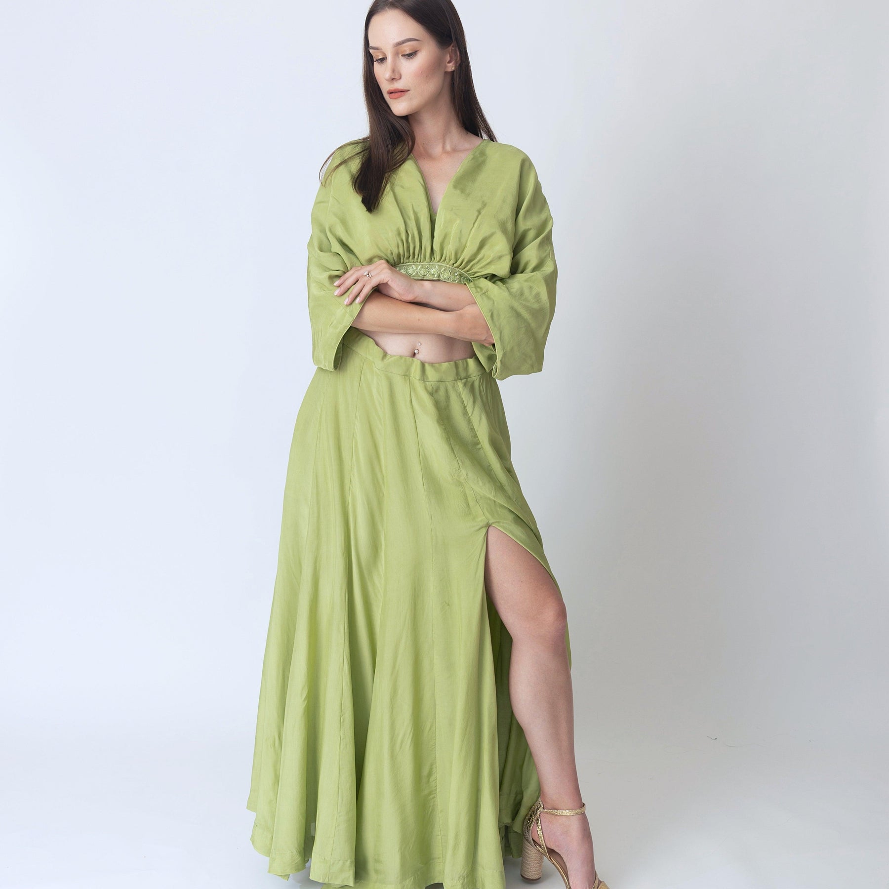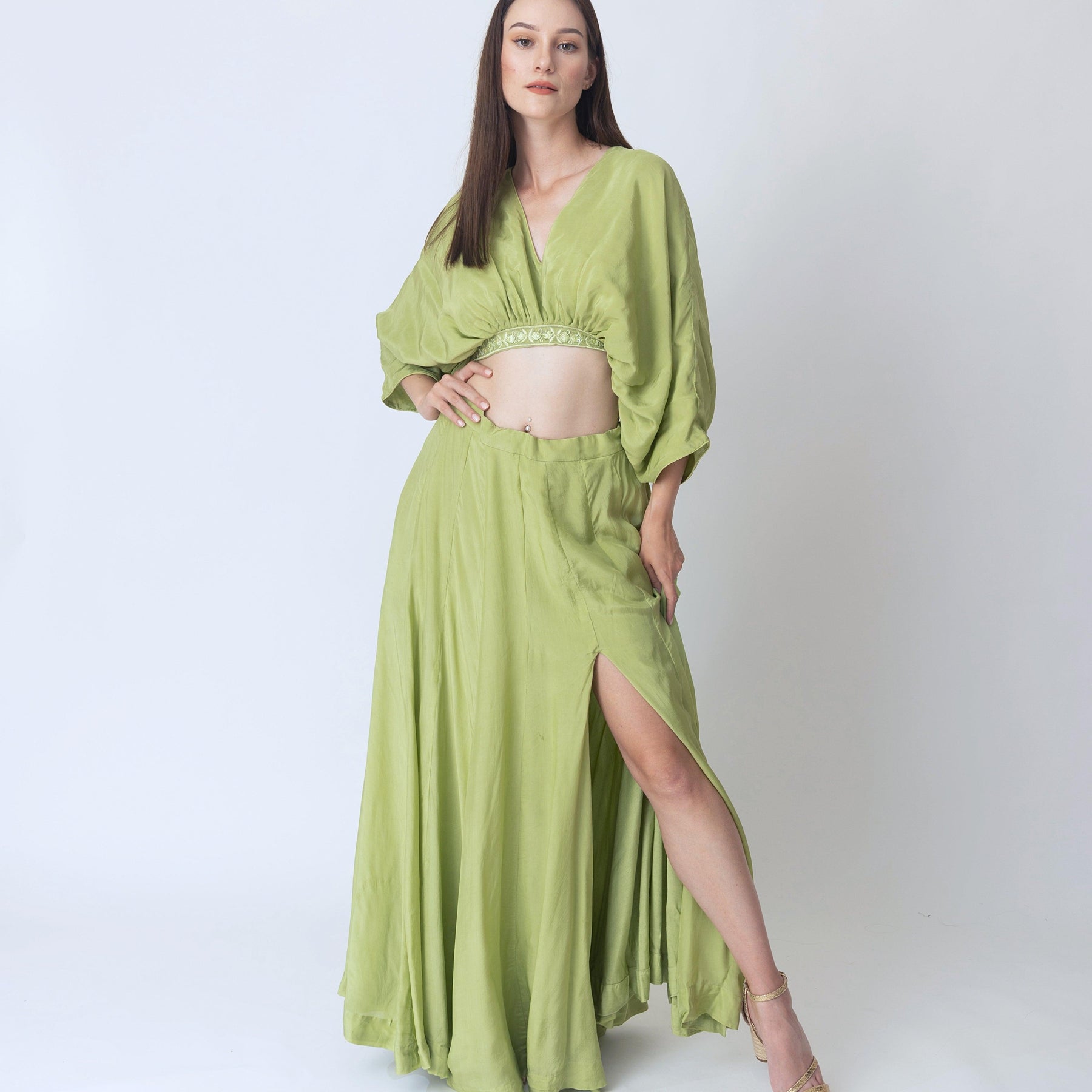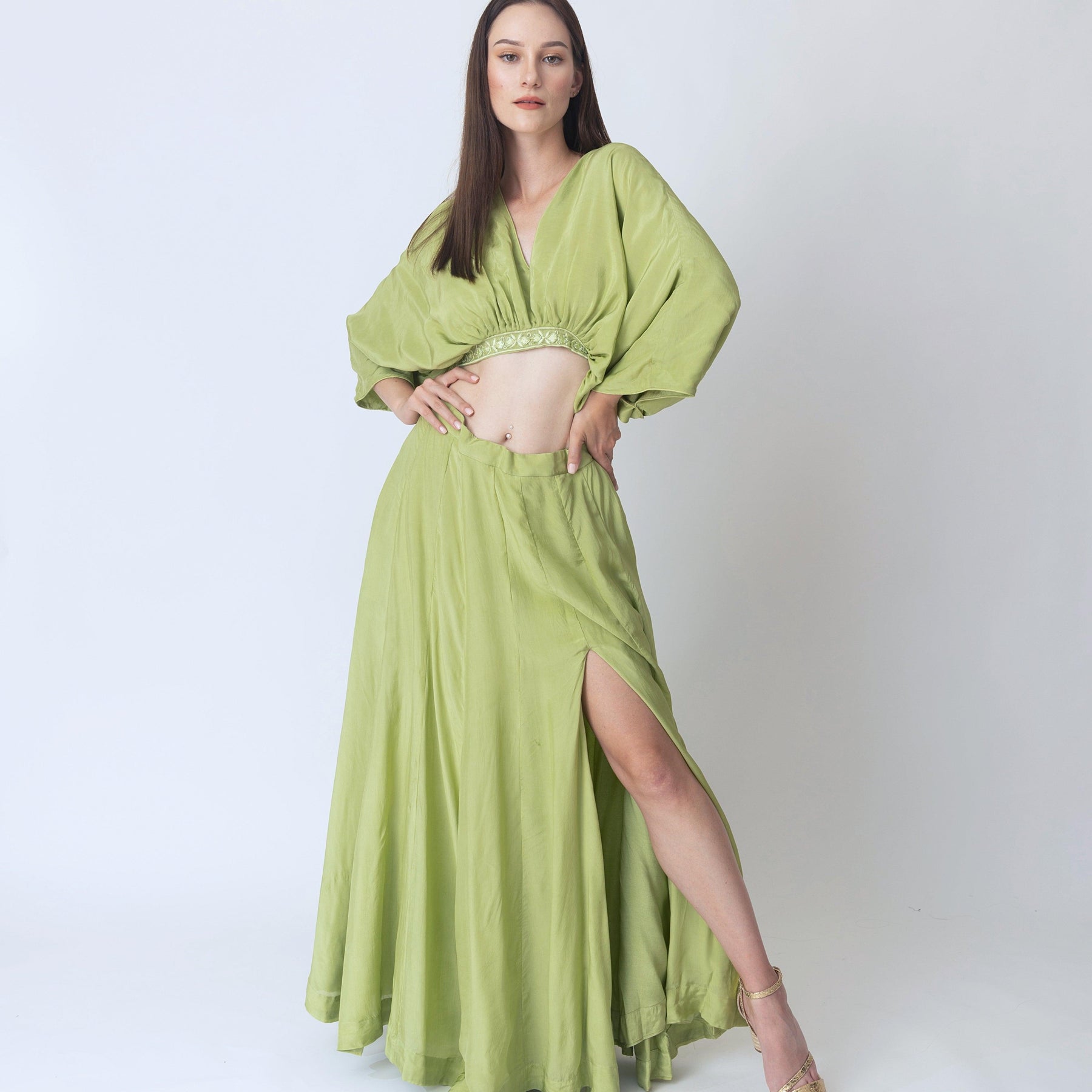 Expertly crafted for effortless sophistication, the Juliet lehenga with side slit offers a modern take on glamour. This piece is made of soft silk that feels beautiful against the skin. The green two piece design exudes fluidity and features a flattering v-neckline. Perfect for any occasion, this suit promises a comfortable and polished look.