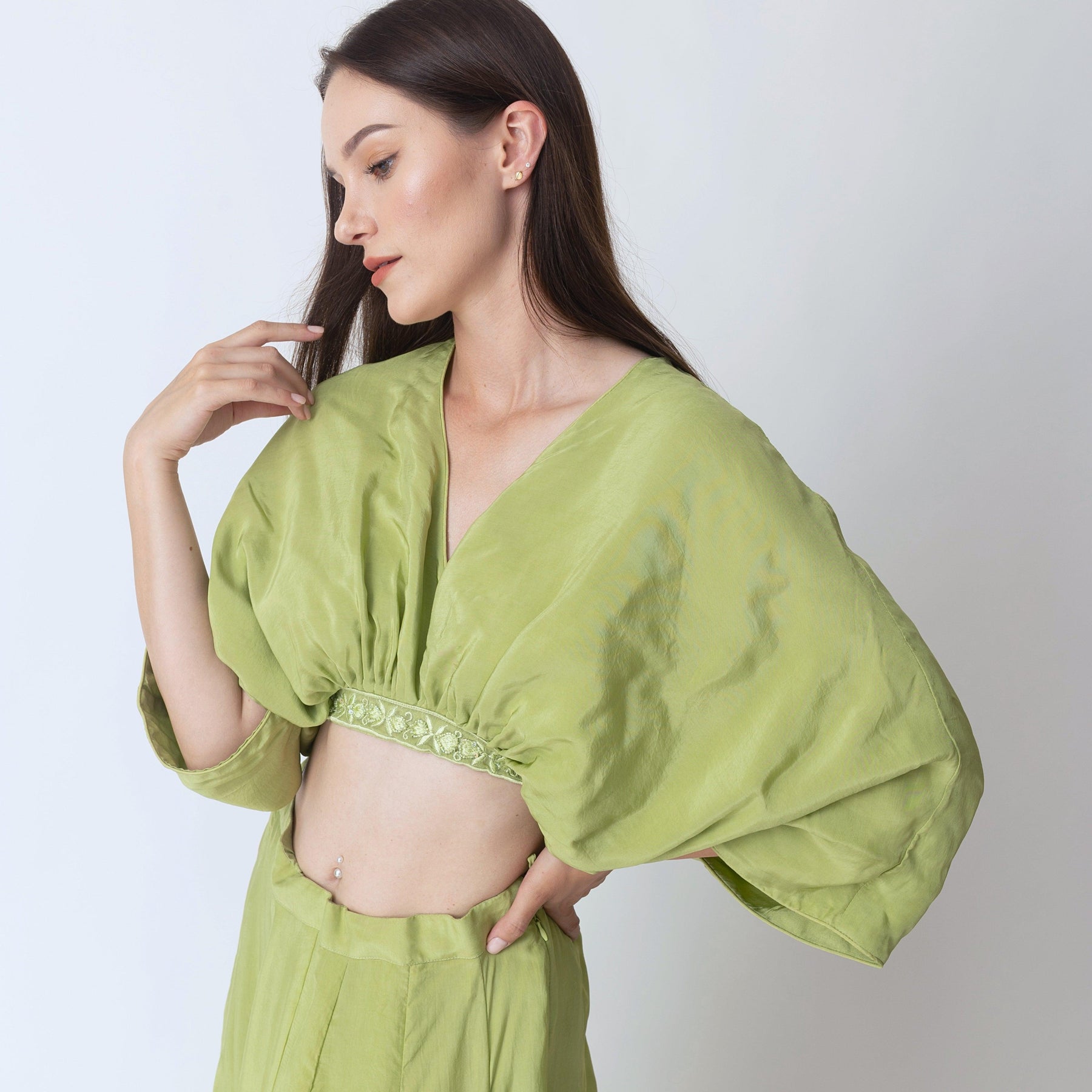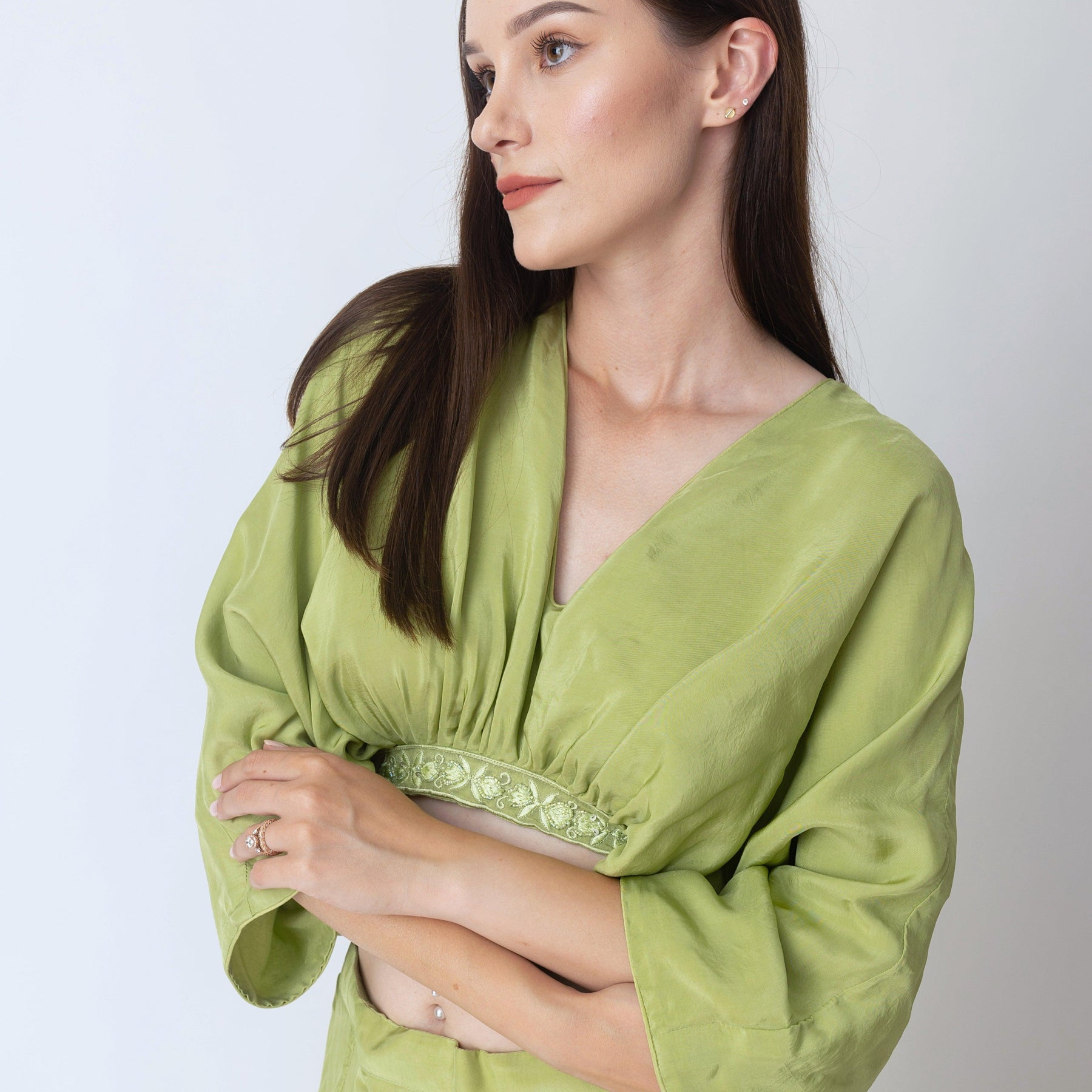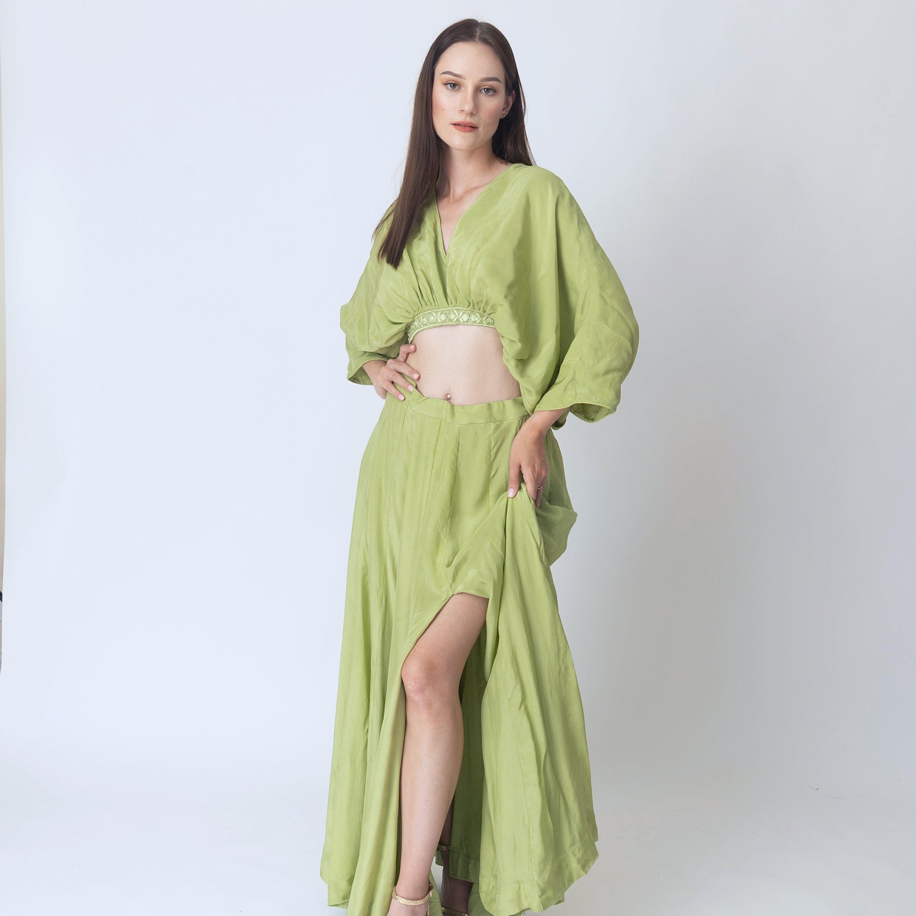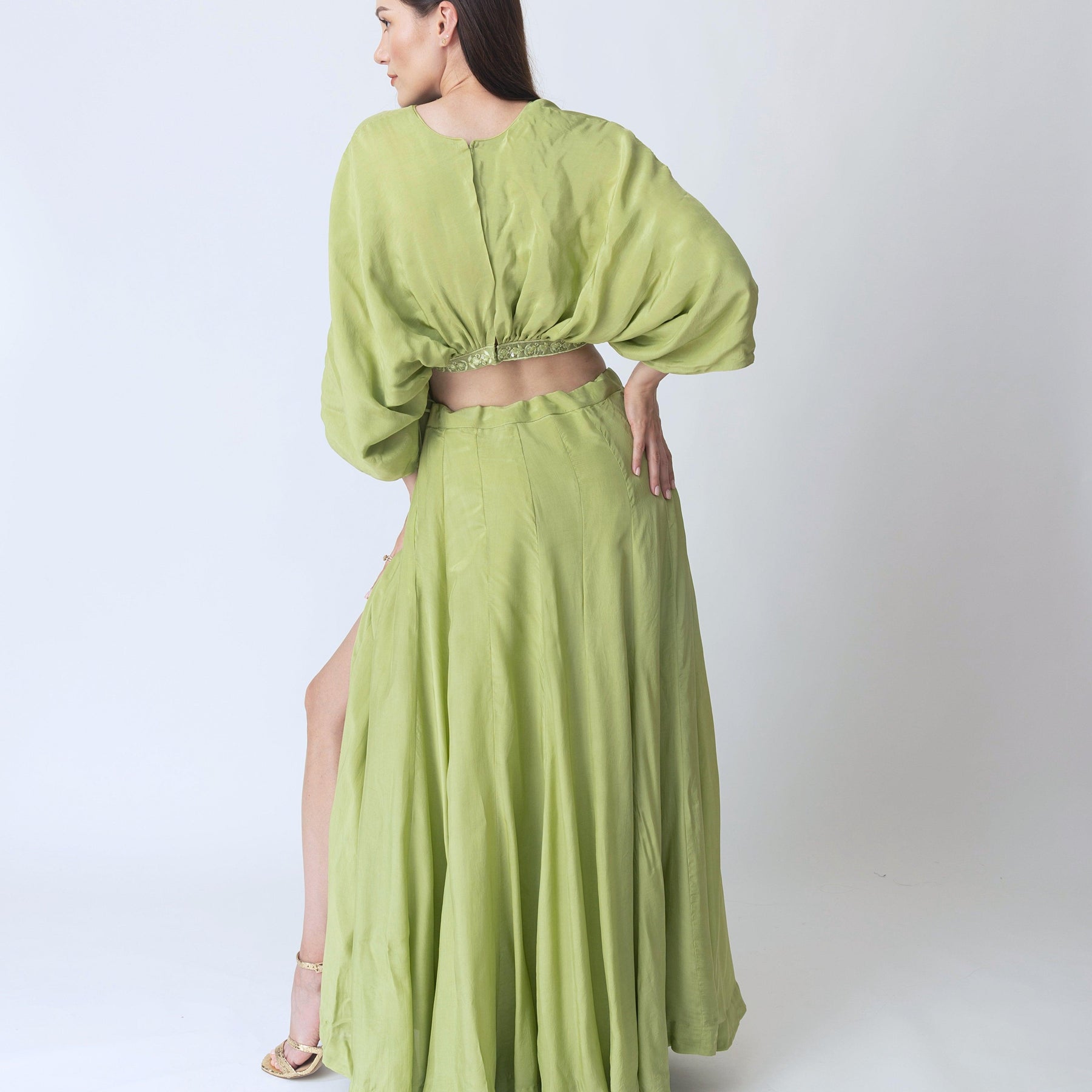 Expertly crafted for effortless sophistication, the Juliet lehenga with side slit offers a modern take on glamour. This piece is made of soft silk that feels beautiful against the skin. The green two piece design exudes fluidity and features a flattering v-neckline. Perfect for any occasion, this suit promises a comfortable and polished look.