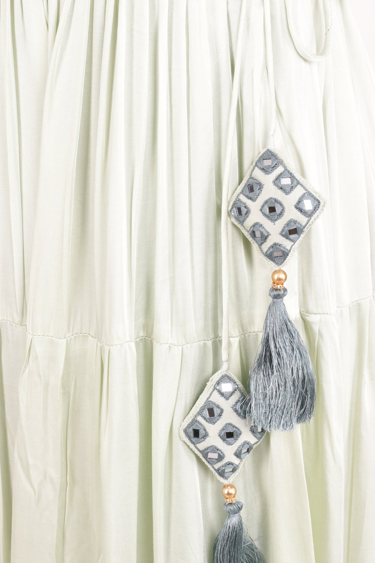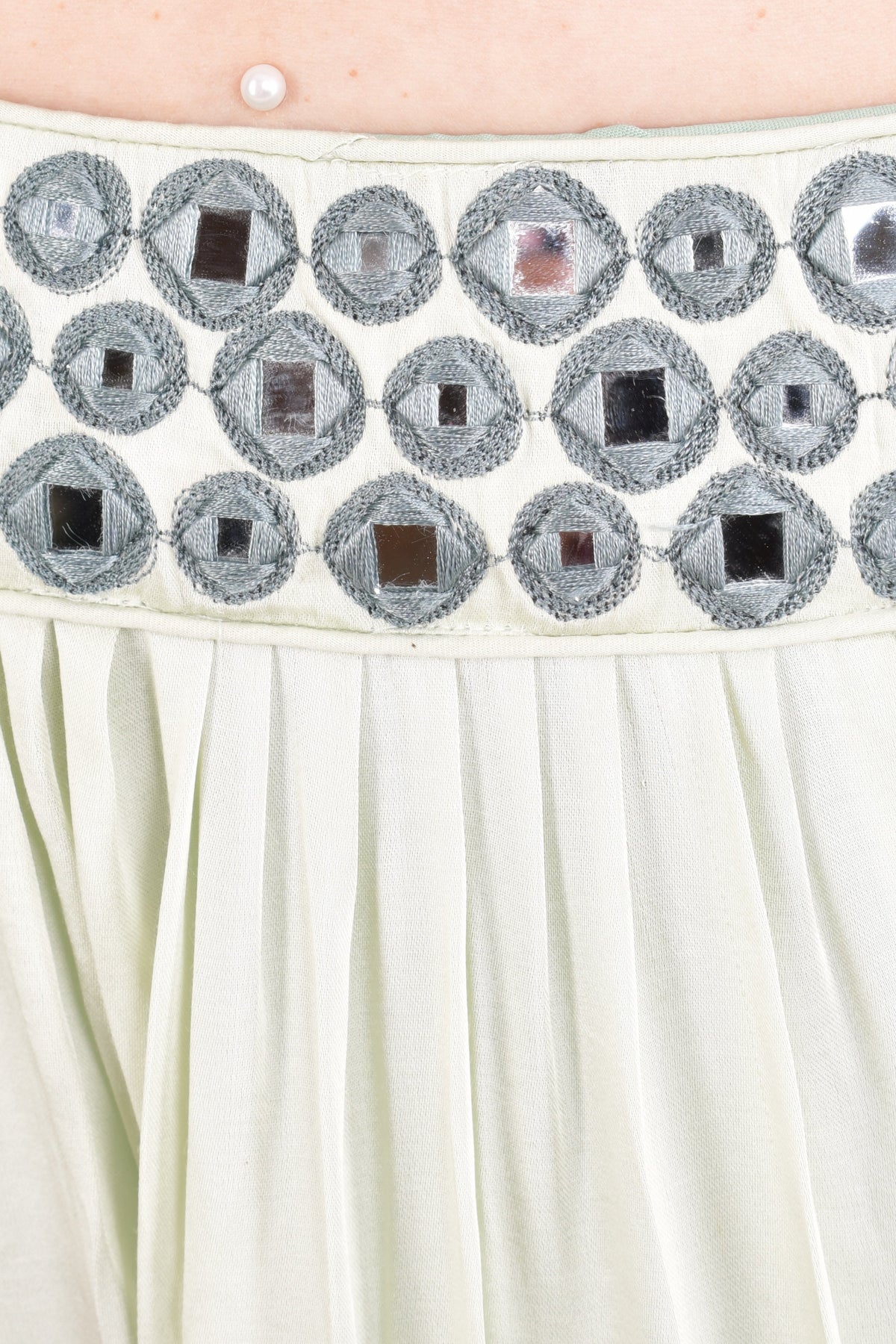 Make a statement in this light green silk lehenga choli set that blends tradition with a modern vibe. The blouse stuns with all-over mirror work, while the tiered lehenga mirrors the shimmer with its own mirror embroidery near the waistline. The Jelena Lehenga Choli set is finished with a soft mul cotton dupatta that features a delicately embroidered border and subtle all-over floral motifs. This lehenga choli is a standout choice for wedding, festive evenings, and anything in between.