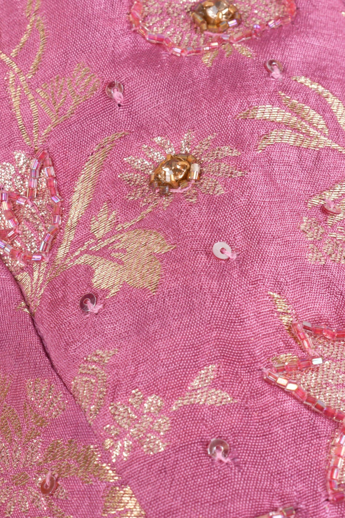 The Rhosyn Pink Shimmer Pre Draped Saree brings together ease and elegance with its pre-pleated shimmer drape in a soft dusty pink hue, finished with a built-in petticoat. The shimmer saree is paired with a Banarasi brocade blouse with stone, cutdana, and sequins hand embroidery. This pre-pleated Shimmer Saree is an effortless blend of tradition and sparkle.
