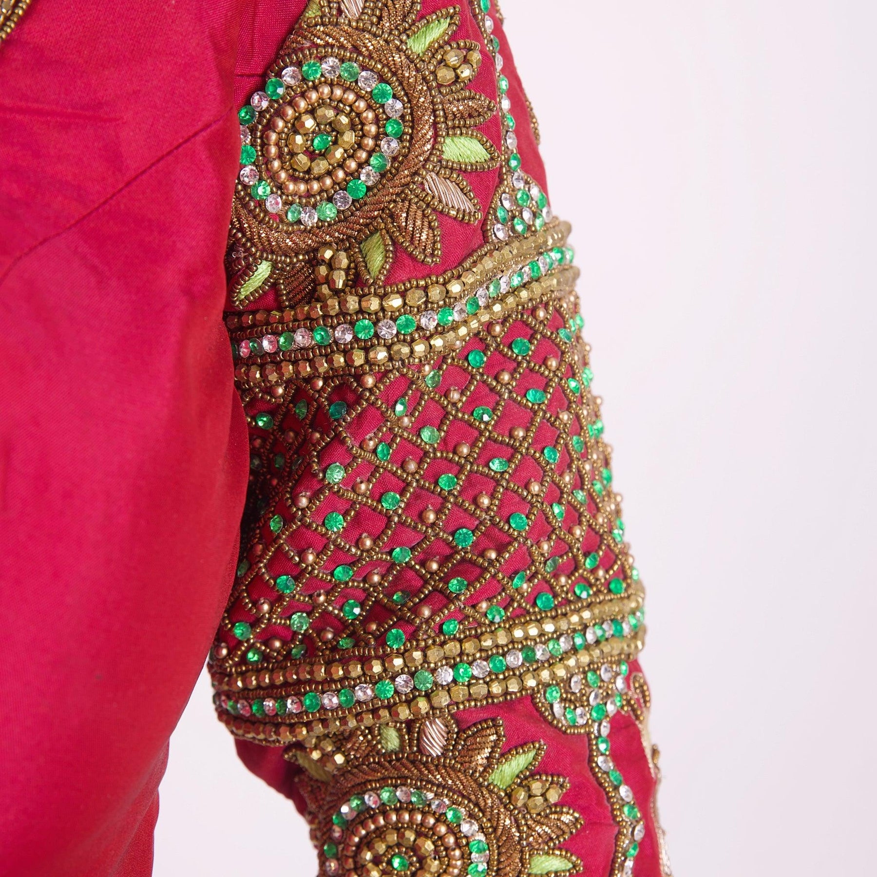 - Specifications: Fully lined; hand embroidered with stone, cutdana, & resham work; elbow length sleeves, scoop neck, hook closure