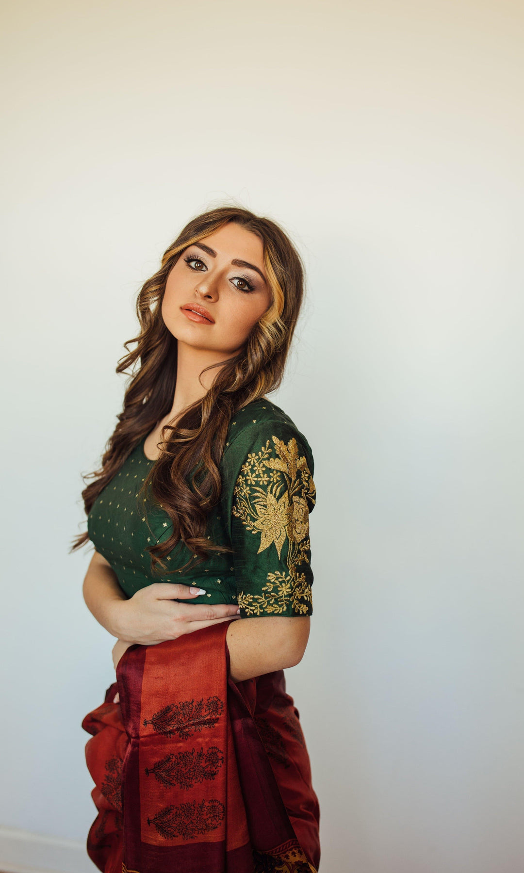 Embrace nature-inspired elegance with the Liana Floral Embroidered Blouse. Crafted in a rich green hue, this blouse features intricate golden embroidery on the sleeves, adorned with delicate floral motifs that add a touch of sophistication. The all-over golden weaving enhances the beauty of the Liana Floral Embroidered Blouse, creating a luxurious and timeless look perfect for any special occasion.