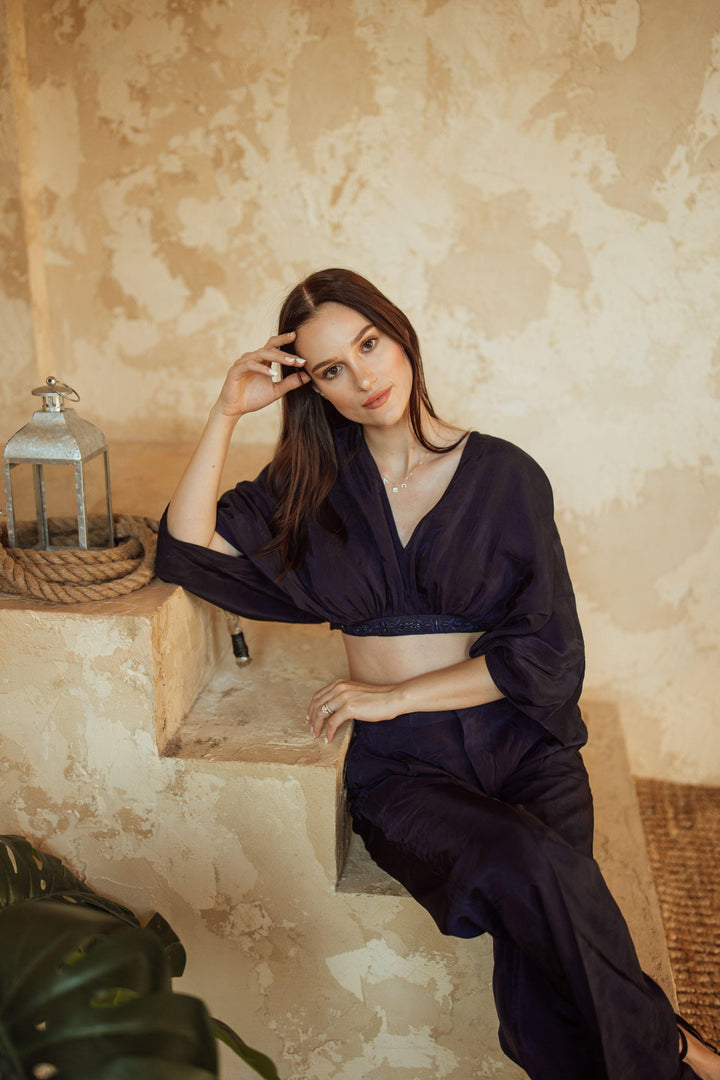 Introducing the Mikaela Top, made with luxurious navy silk for a soft feel. The delicate beading along the bottom adds a touch of elegance, while the flowy loose arms provide a comfortable and relaxed fit. Elevate your style with this versatile and sophisticated top.
