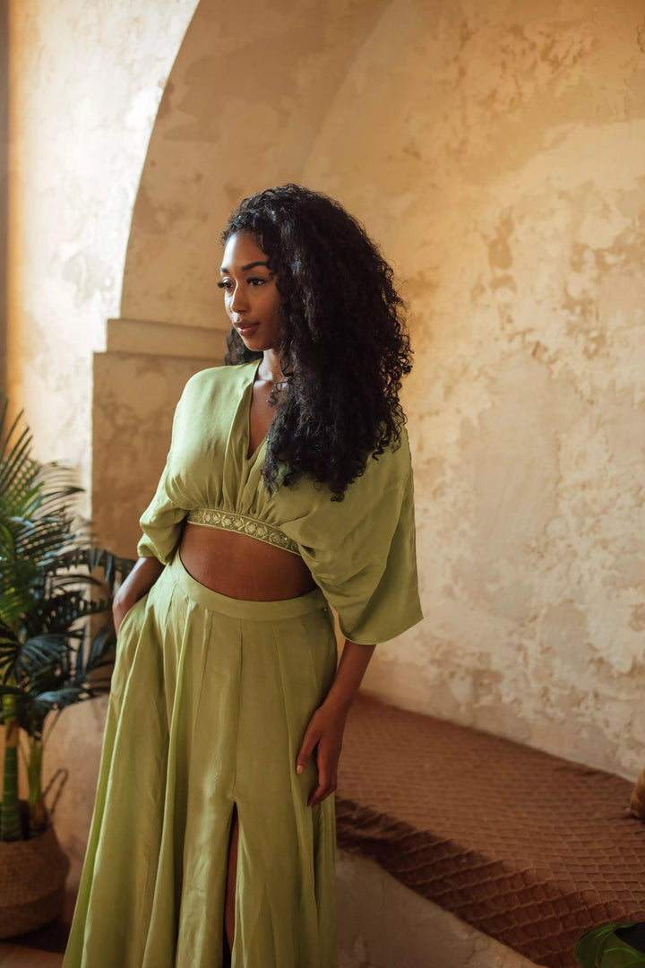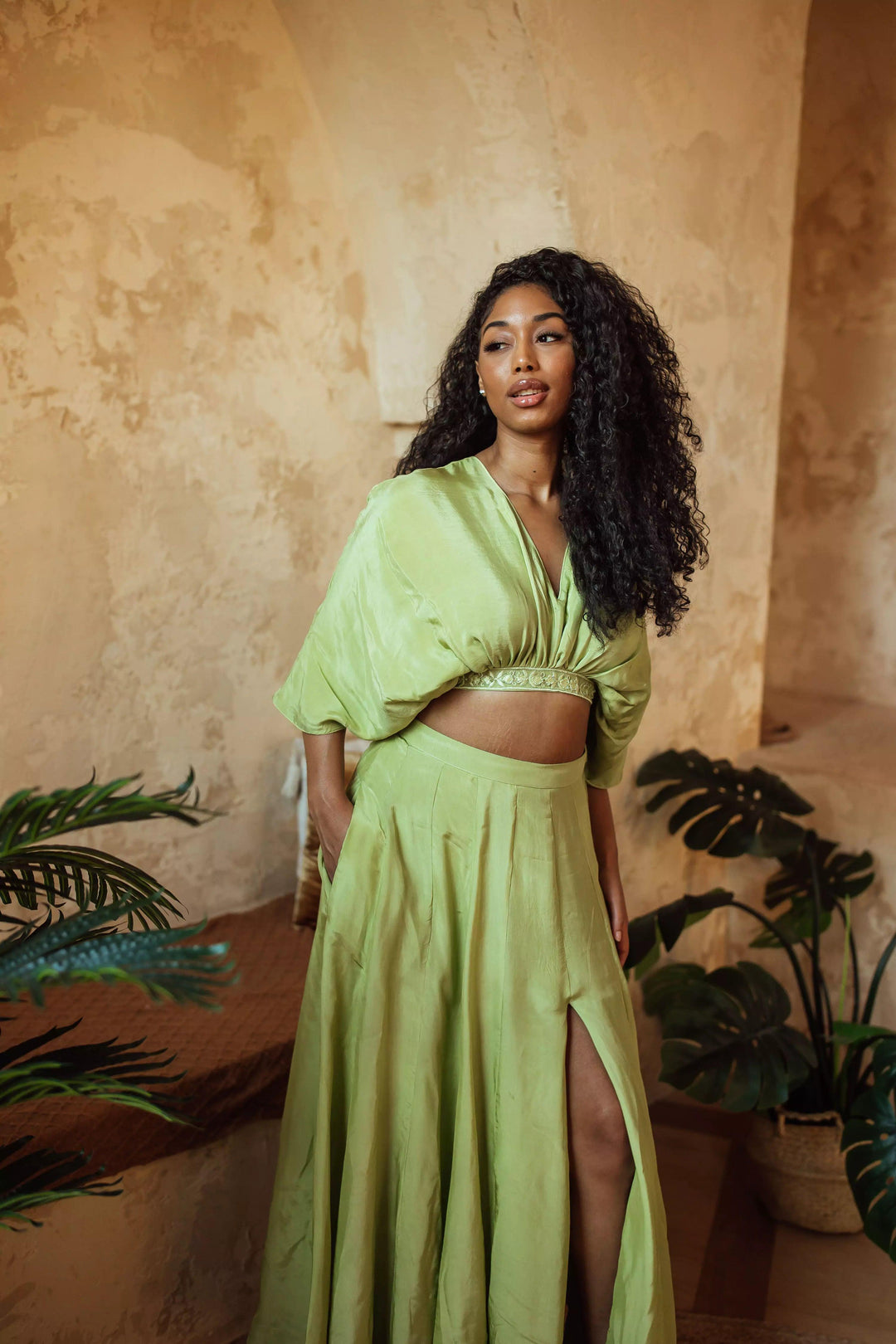 Introducing the Juliet Top, made with luxurious green soft silk for a soft feel. The delicate beading along the bottom adds a touch of elegance, while the flowy loose arms provide a comfortable and relaxed fit. Elevate your style with this versatile and sophisticated top.