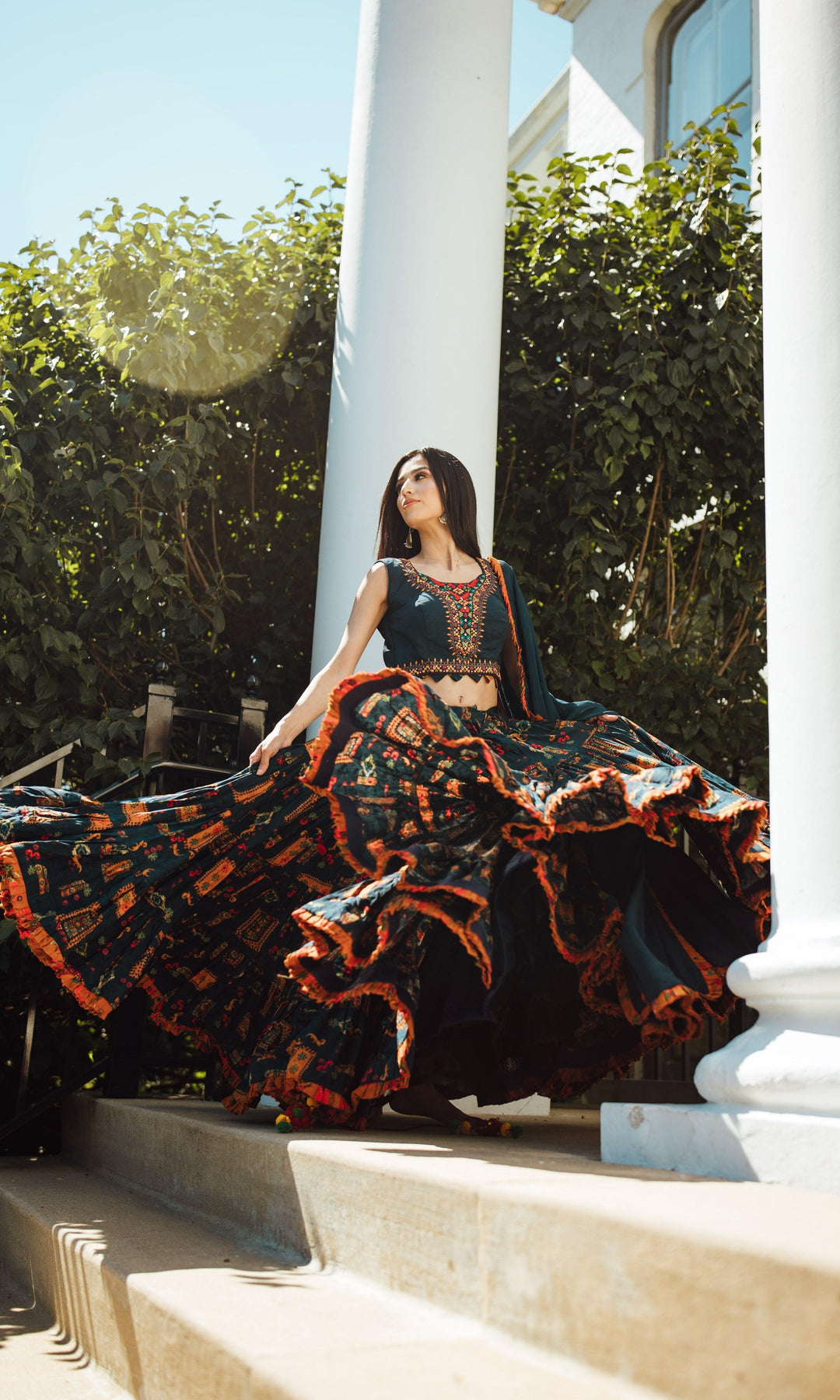 The skirt boasts a voluminous 25-meter flare, adding a dramatic flow to every twirl. It’s further enhanced with traditional prints, resham work, and patchwork. The hand-embroidered blouse complements the skirt beautifully, tying the ensemble together with its intricate craftsmanship. A contrasting black georgette dupatta adds elegance and balance to the overall look of this multi-color lehenga choli.