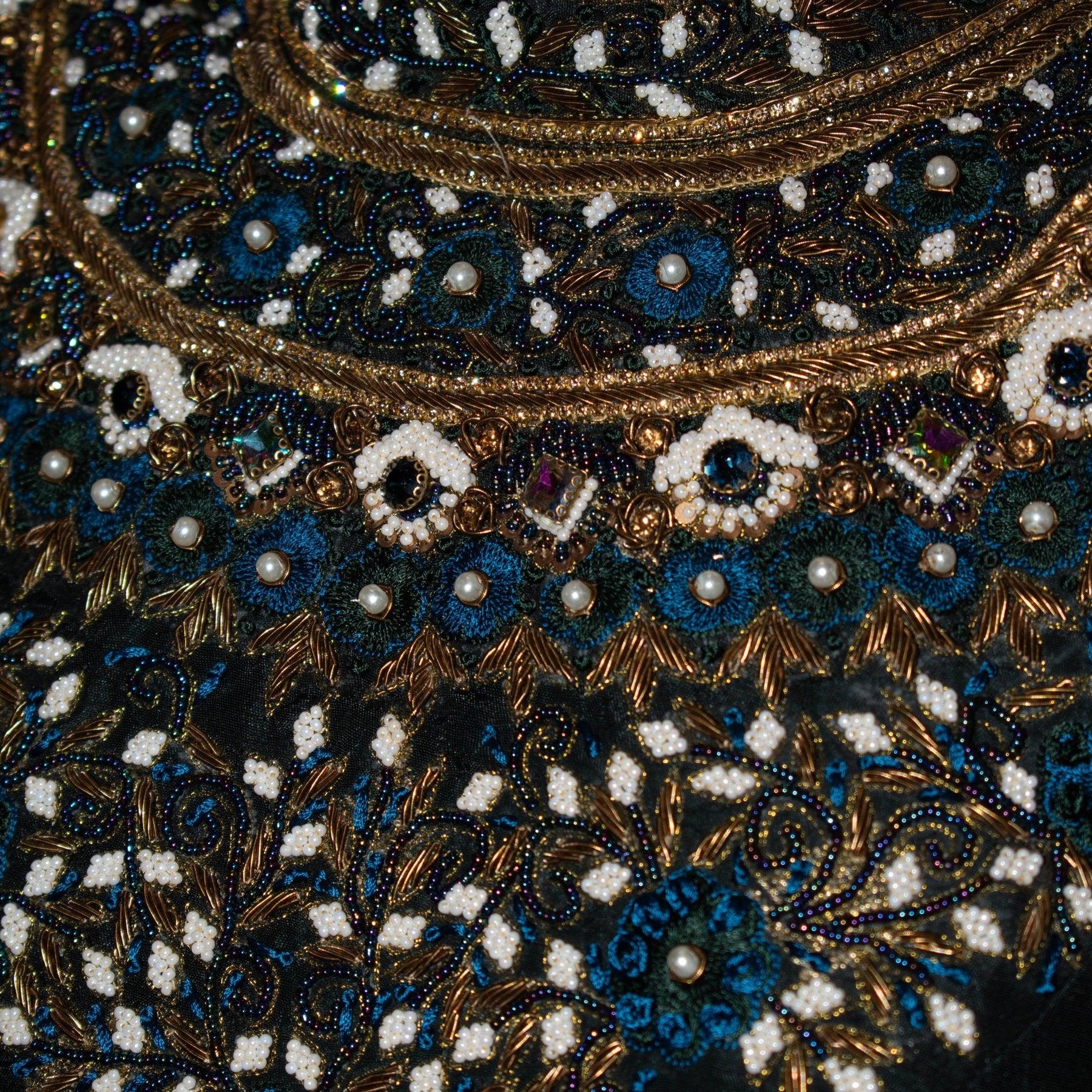 • Blouse: Fully lined, high neck, back closure, sleeveless, heavily embroidered