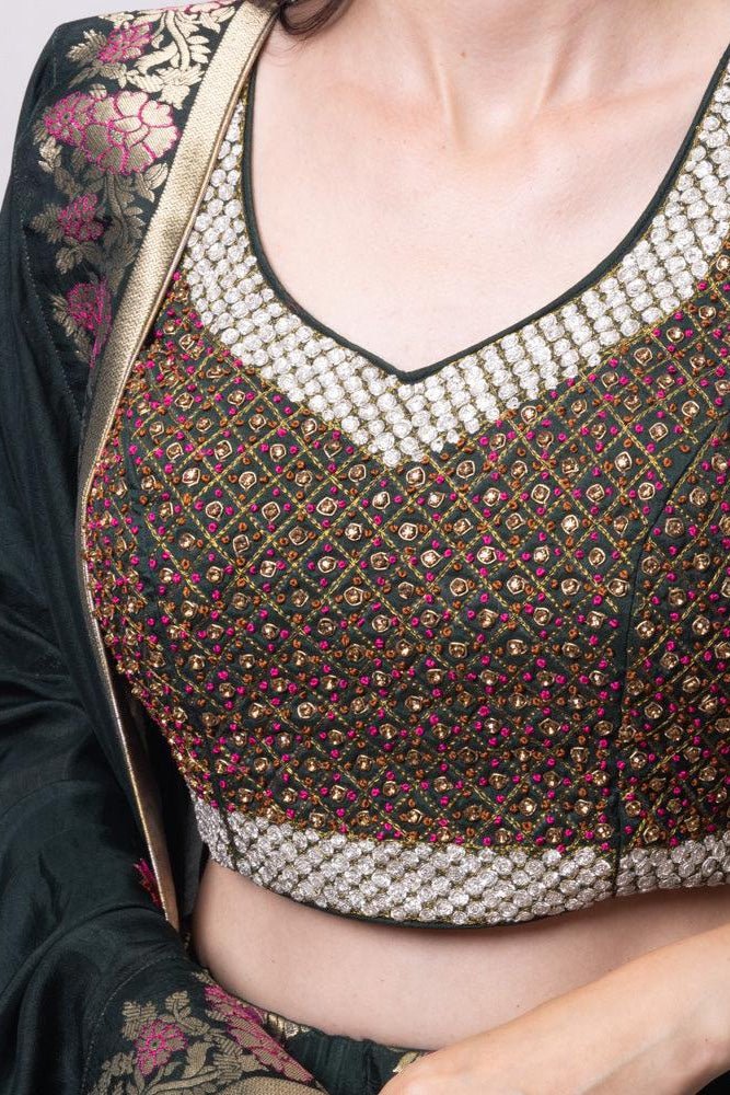 Indulge in the timeless elegance of the Brenna Green Banarasi Lehenga Choli Set, where rich tradition meets modern luxury. The lehenga is crafted from banarasi jacquard silk and complimented with a silk blouse adorning hand embroidered resham, pita, and stone work. Completing the ensemble is a banarasi jacquard silk dupatta.