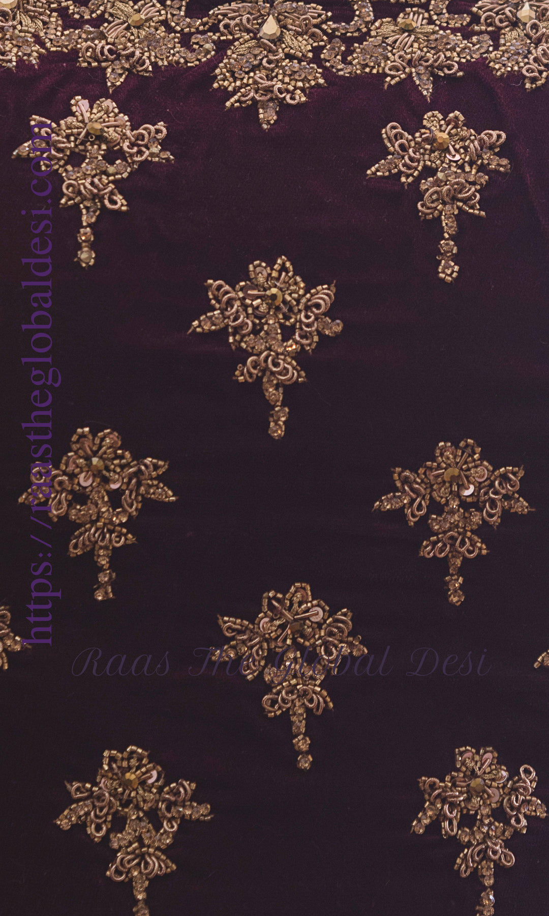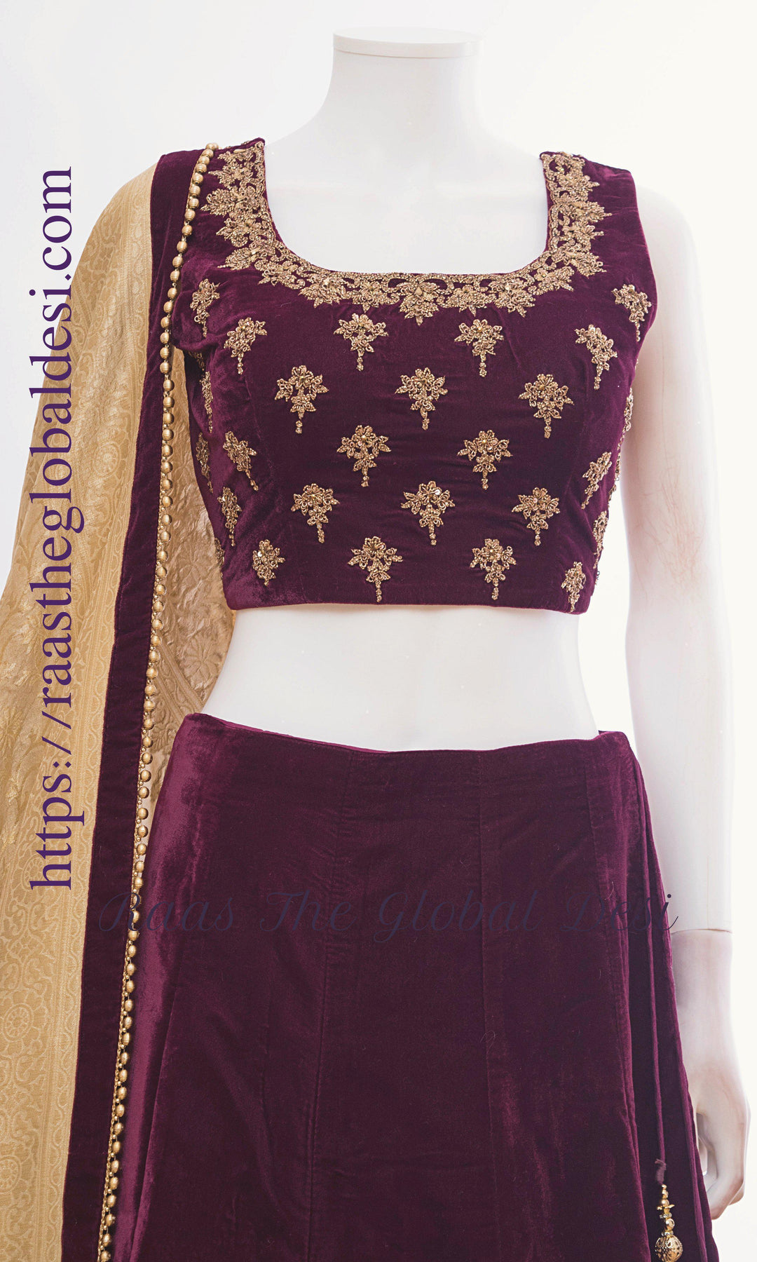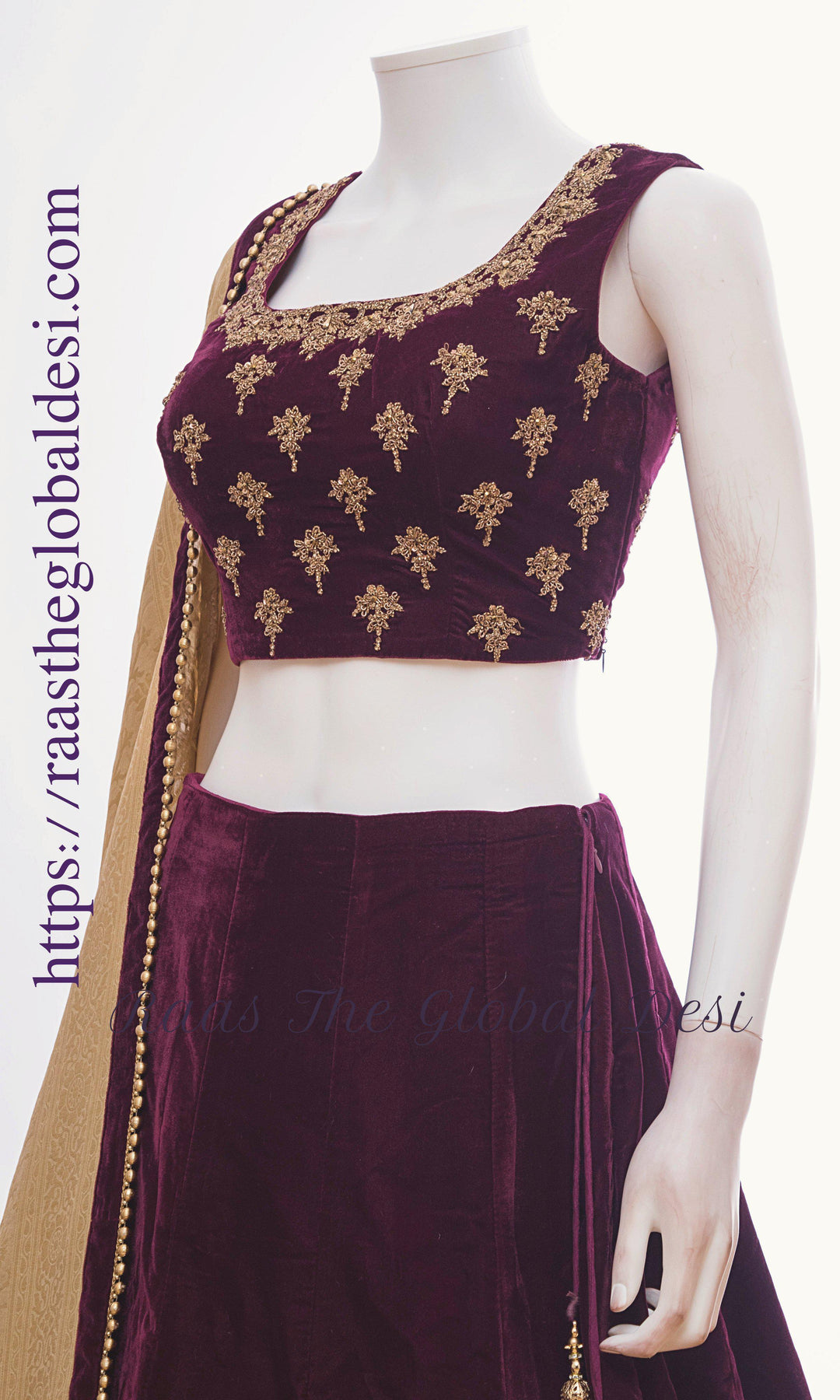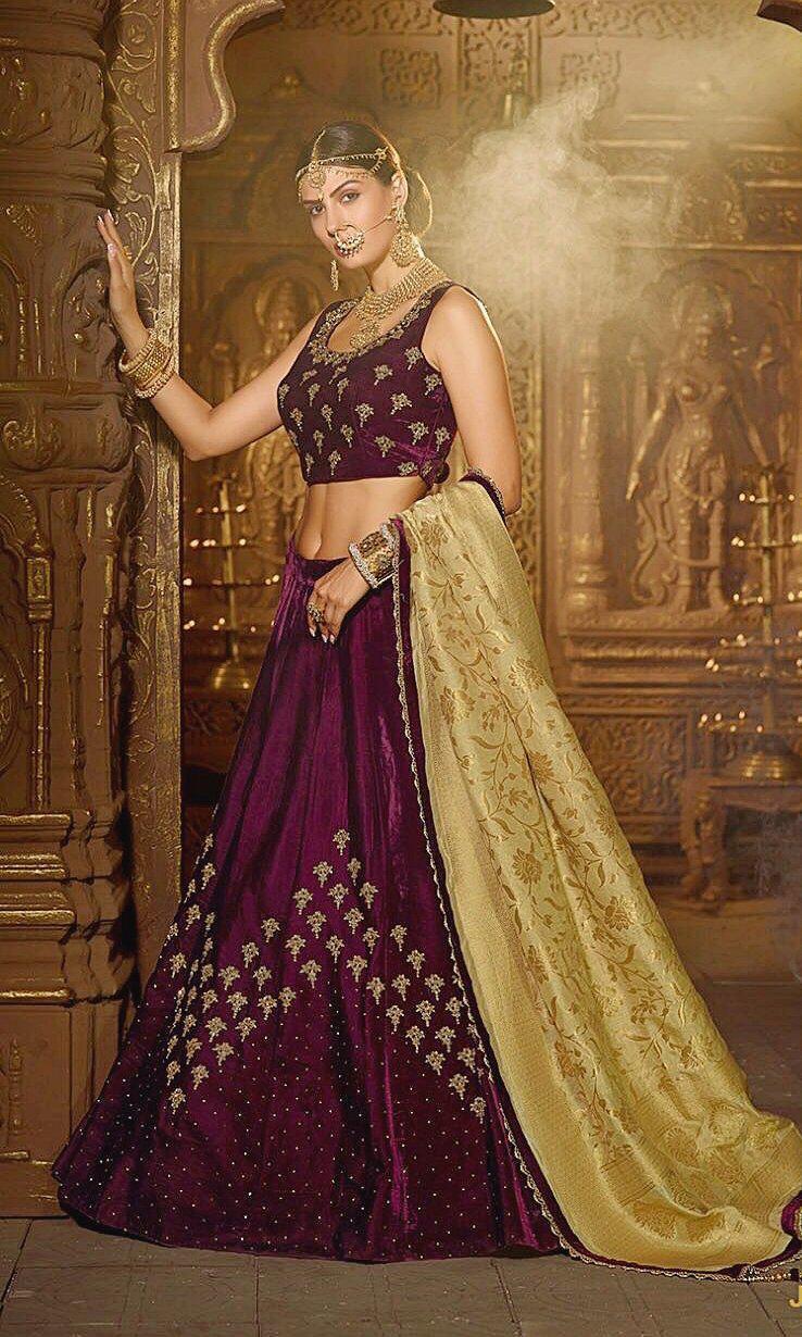 Make a trendy appeal with this enticing violet designer lehenga choli set crafted from rich velvet, embroidered all over the choli and bottom of lehenga in zari motifs and kundan splatters in a breathtaking finish! This lehenga choli set is accompanied with gold brocade silk dupatta with velvet border and zari edging. Note: Color may slightly vary due to digital photography.