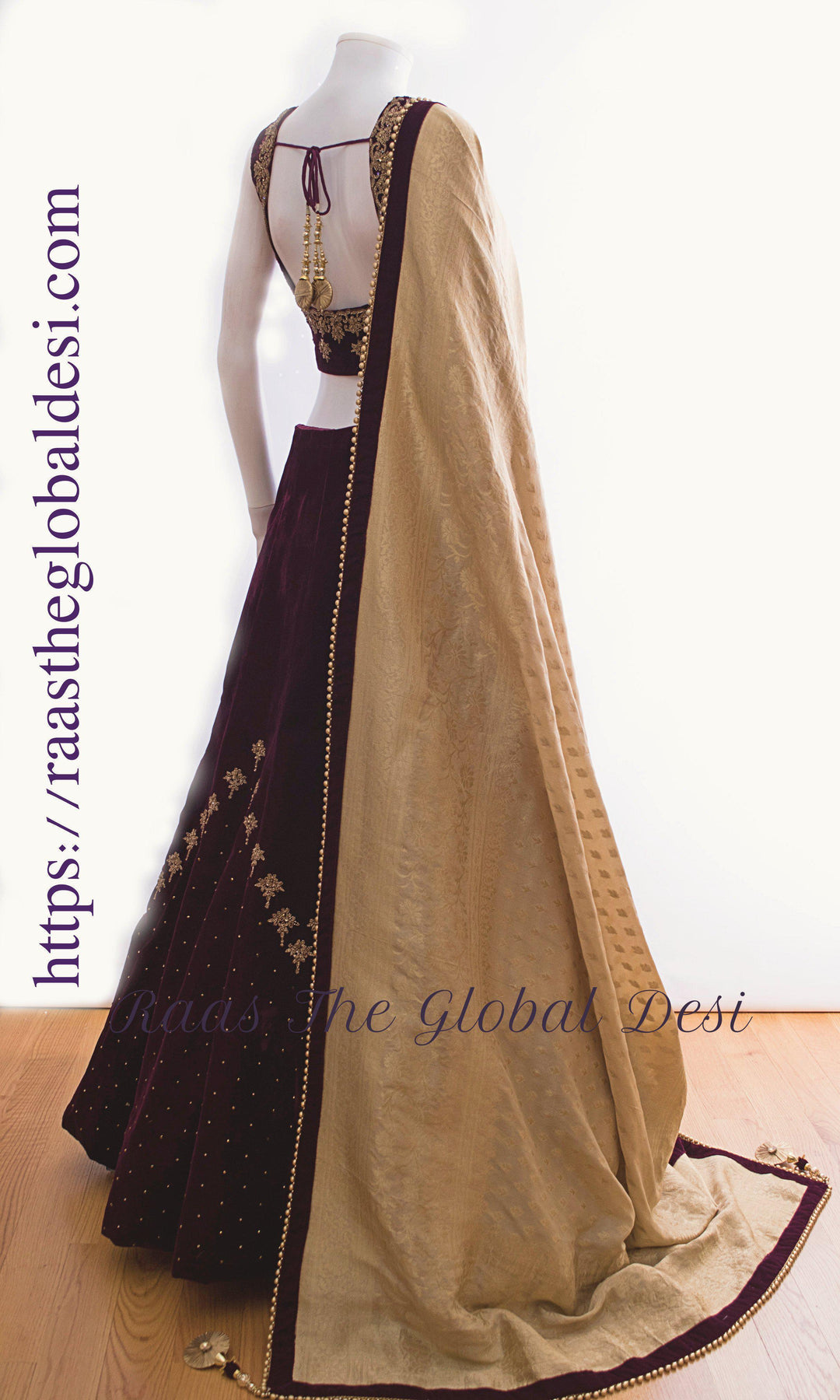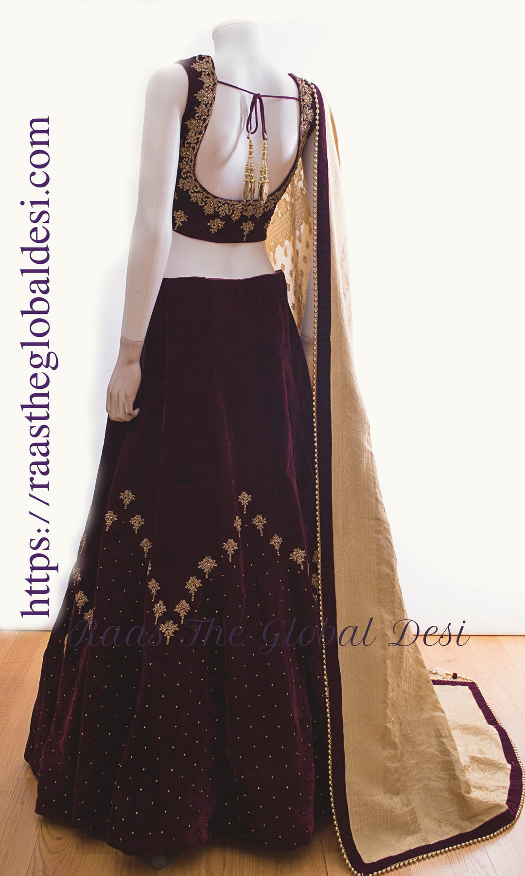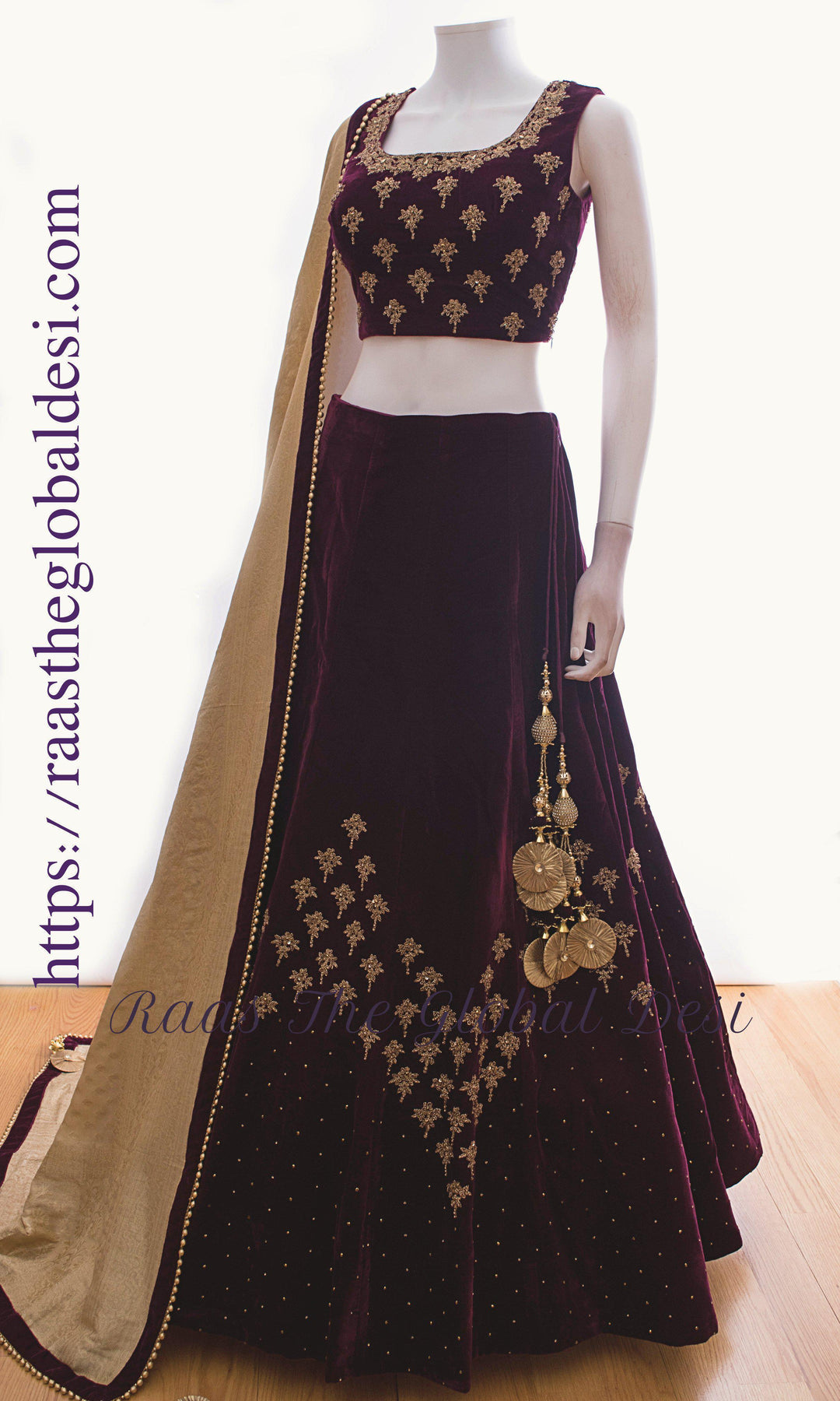 Make a trendy appeal with this enticing violet designer lehenga choli set crafted from rich velvet, embroidered all over the choli and bottom of lehenga in zari motifs and kundan splatters in a breathtaking finish! This lehenga choli set is accompanied with gold brocade silk dupatta with velvet border and zari edging. Note: Color may slightly vary due to digital photography.