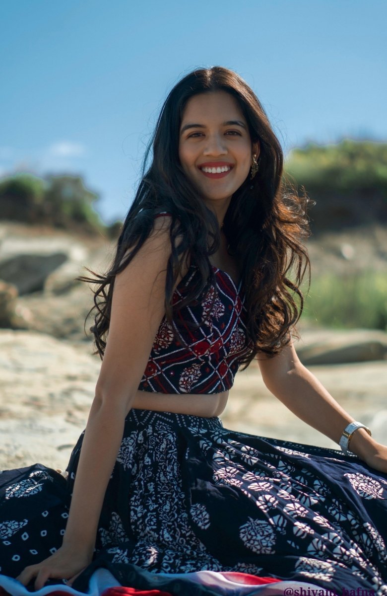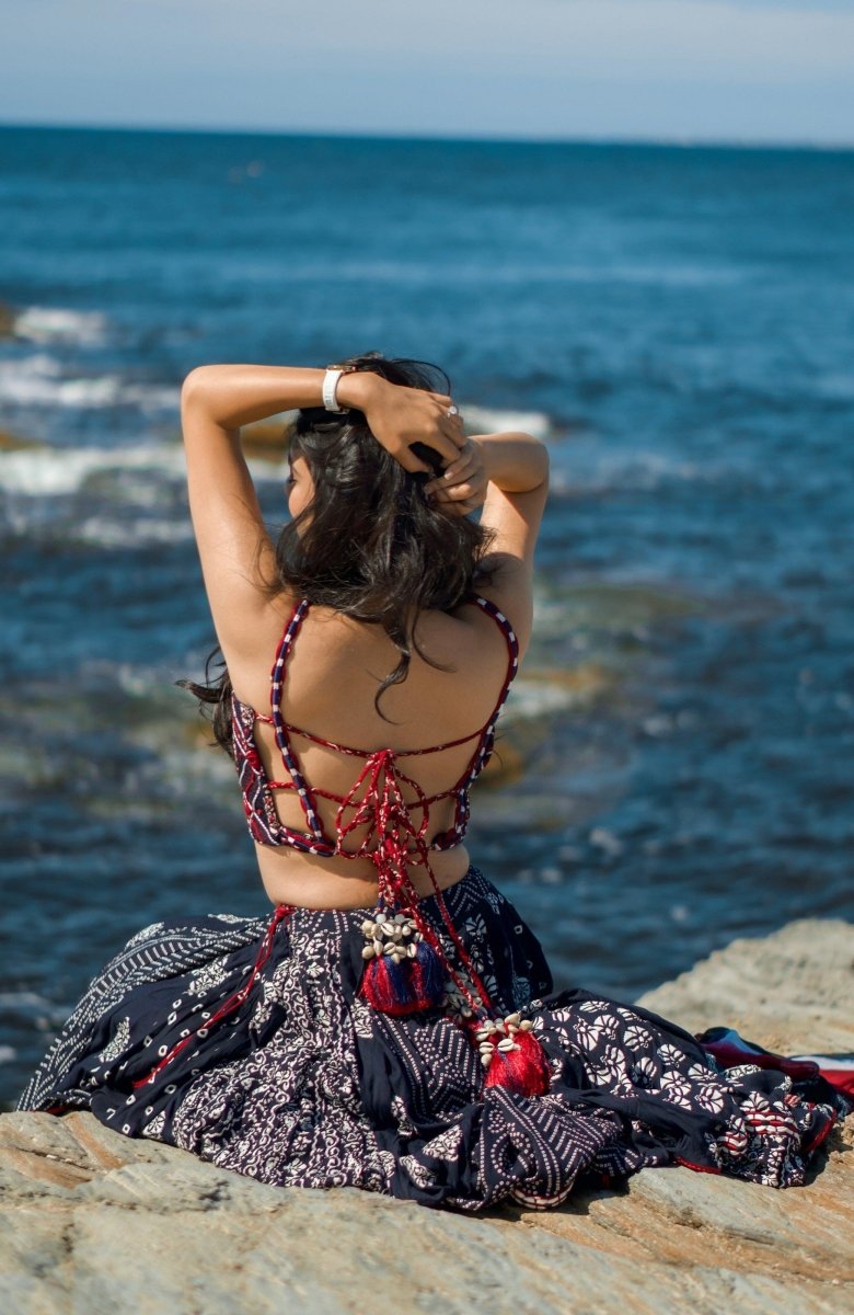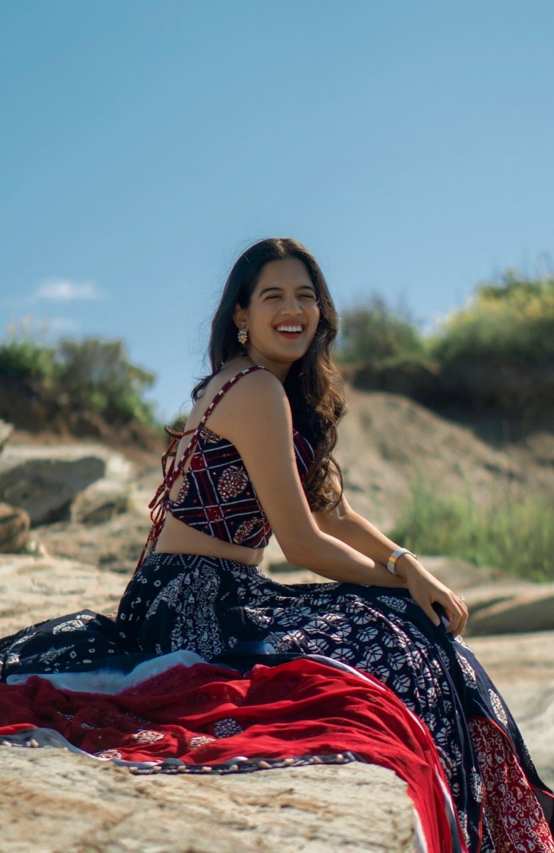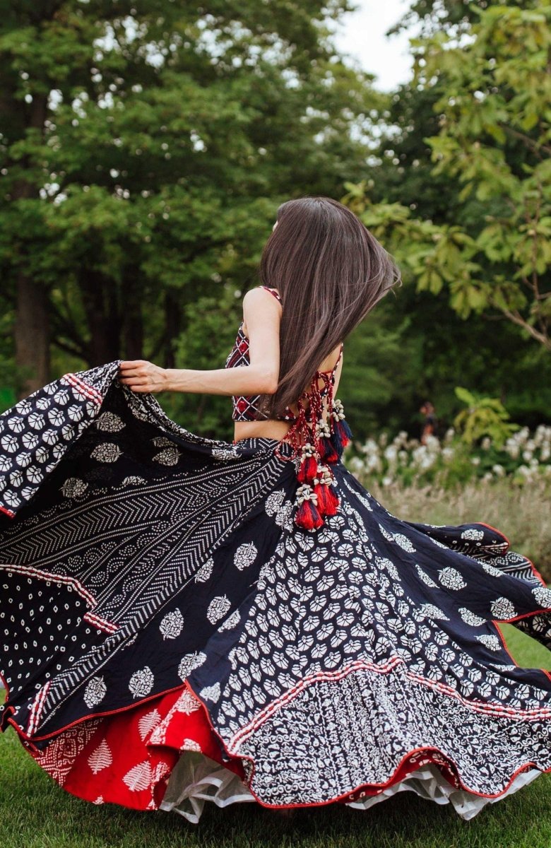 Built for the dance floor, this navy blue block print chaniya choli is as spectacular in motion as it is at rest. The full 20-meter flare chaniya delivers a breathtaking twirl, layered with multi-panel block prints in white and red across bandhani, floral, and geometric motifs. The contrast red border and lining add a vibrant pop that comes alive with every spin. The sleeveless crop blouse features intricate mirror and thread work embroidery with a flattering fitted silhouette, while the printed georgette dupatta completes the set with effortless grace. A statement Garba and Navratri outfit that ships from the USA — ready to wear for the night you've been waiting for all year.