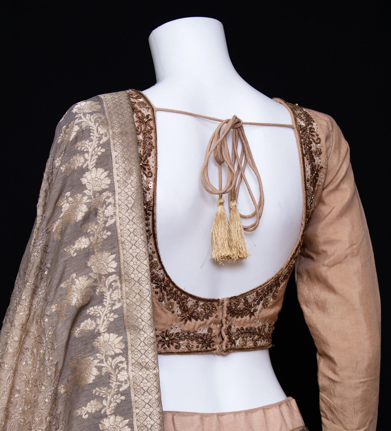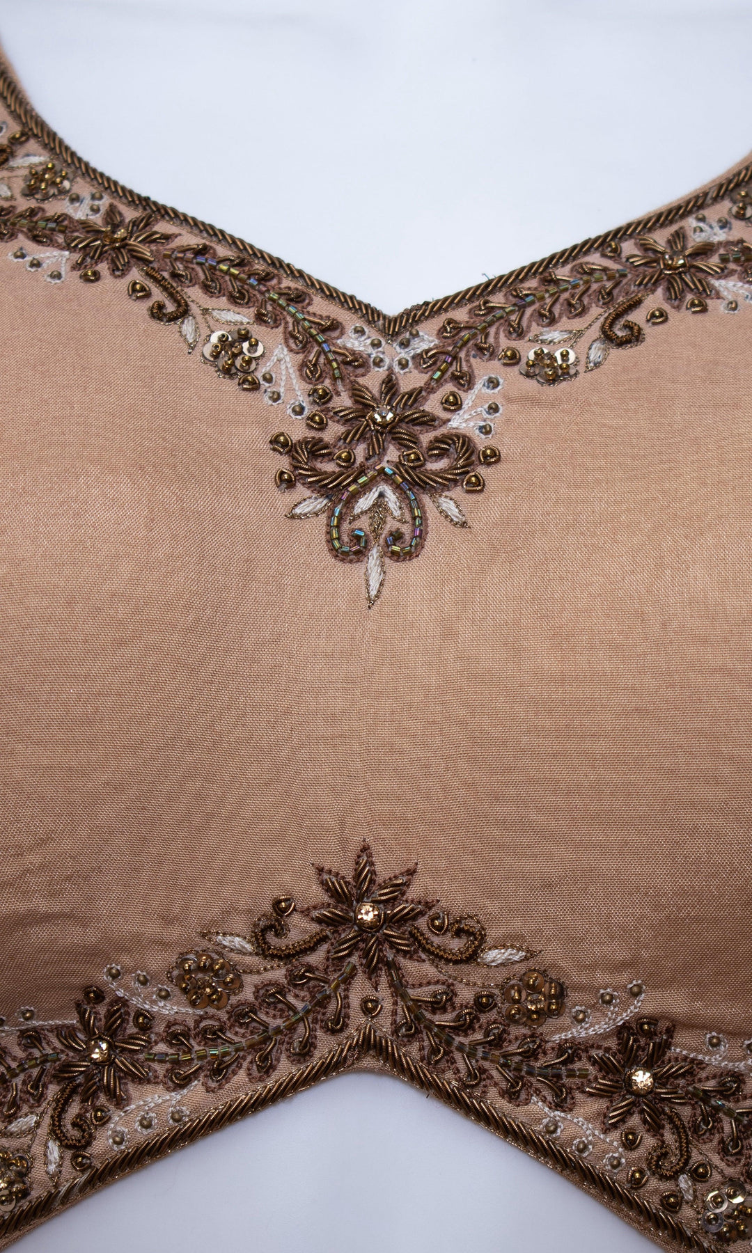 - Blouse: Sleeveless, fully lined, closed back with string tie; Hand embroidered with stone, zardoshi, kasab work