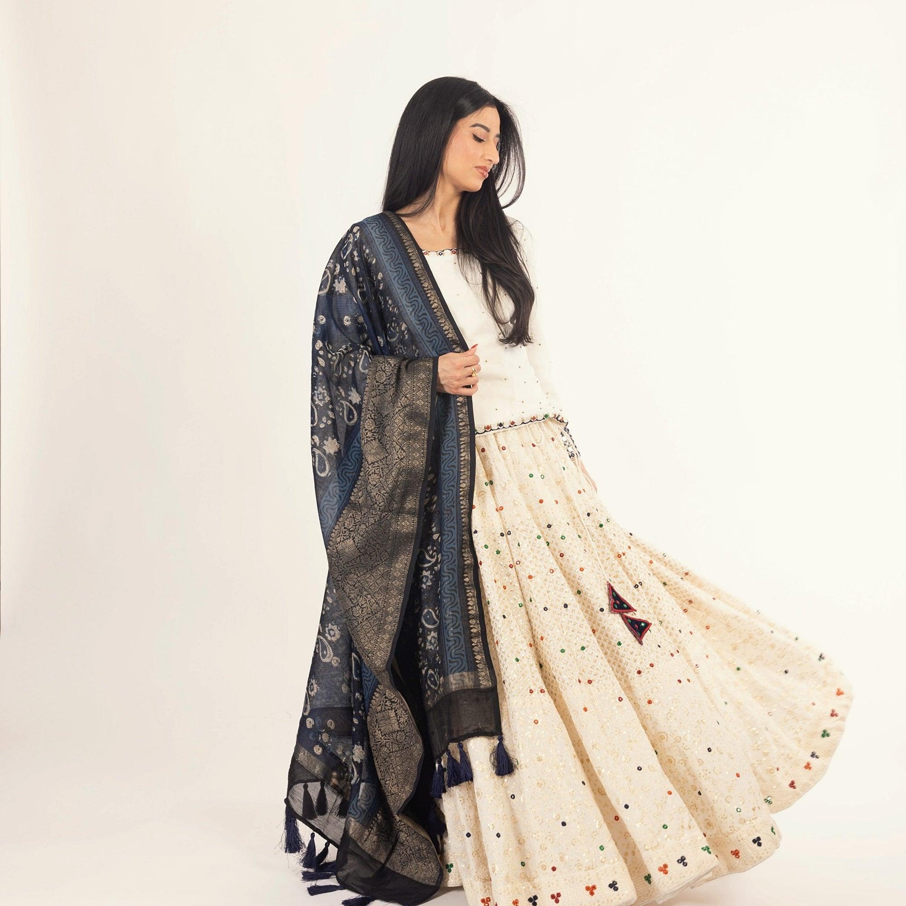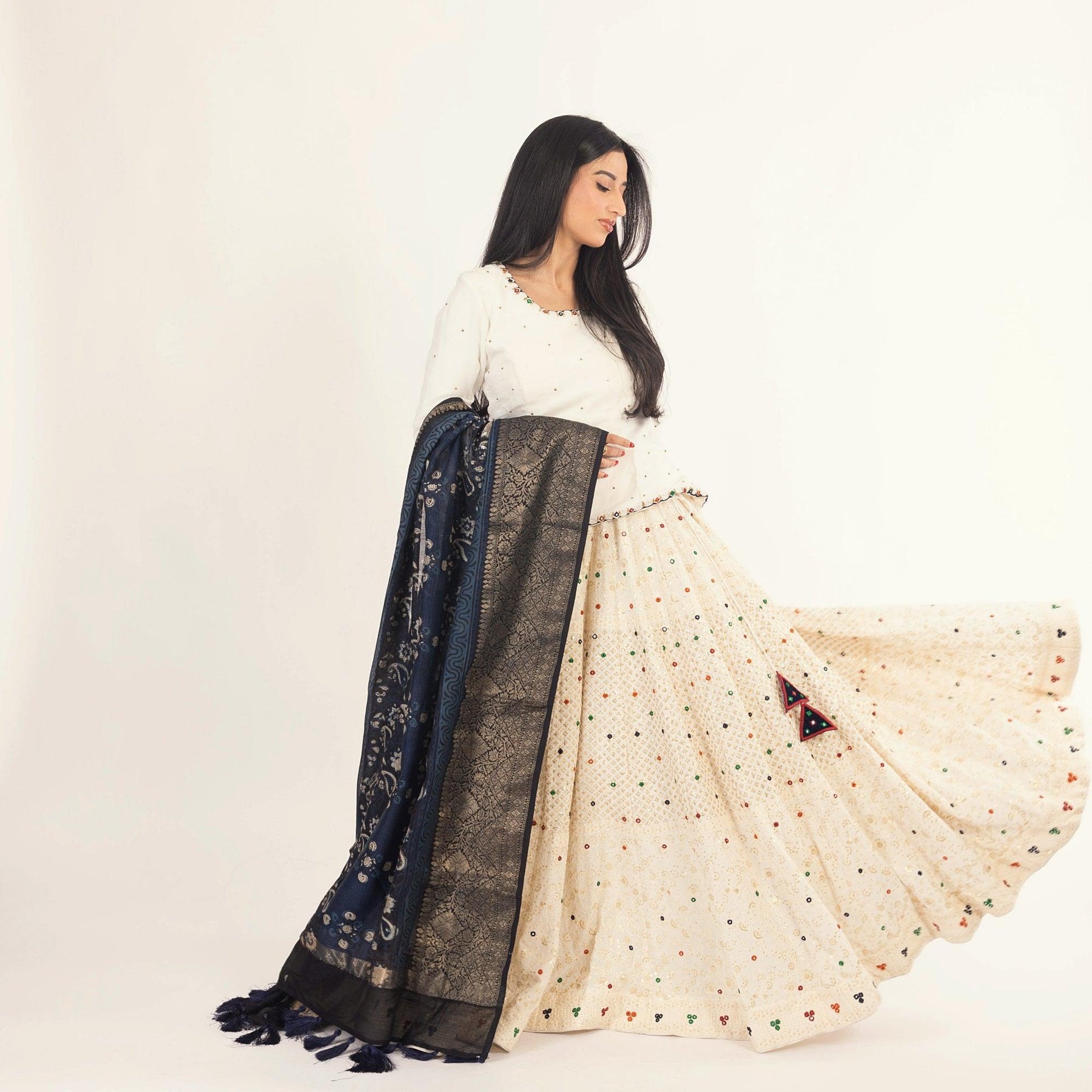 Elevate your wardrobe with the enchanting Neve White Lehenga Choli Set, a celebration of intricate artistry. The long sleeves georgette peplum blouse is richly detailed with mirror, cutdana, sequins, and resham embroidery. The georgette lehenga dazzles with chikankari, sequins, and mirror embroidery, while the navy silk dupatta adds a bold contrast with its hand-block prints and luxurious Banarasi border. Designed in a soft white shade, the Neve White Lehenga Choli Set is perfect for unforgettable occasions where you want to stay subtle yet turn heads.