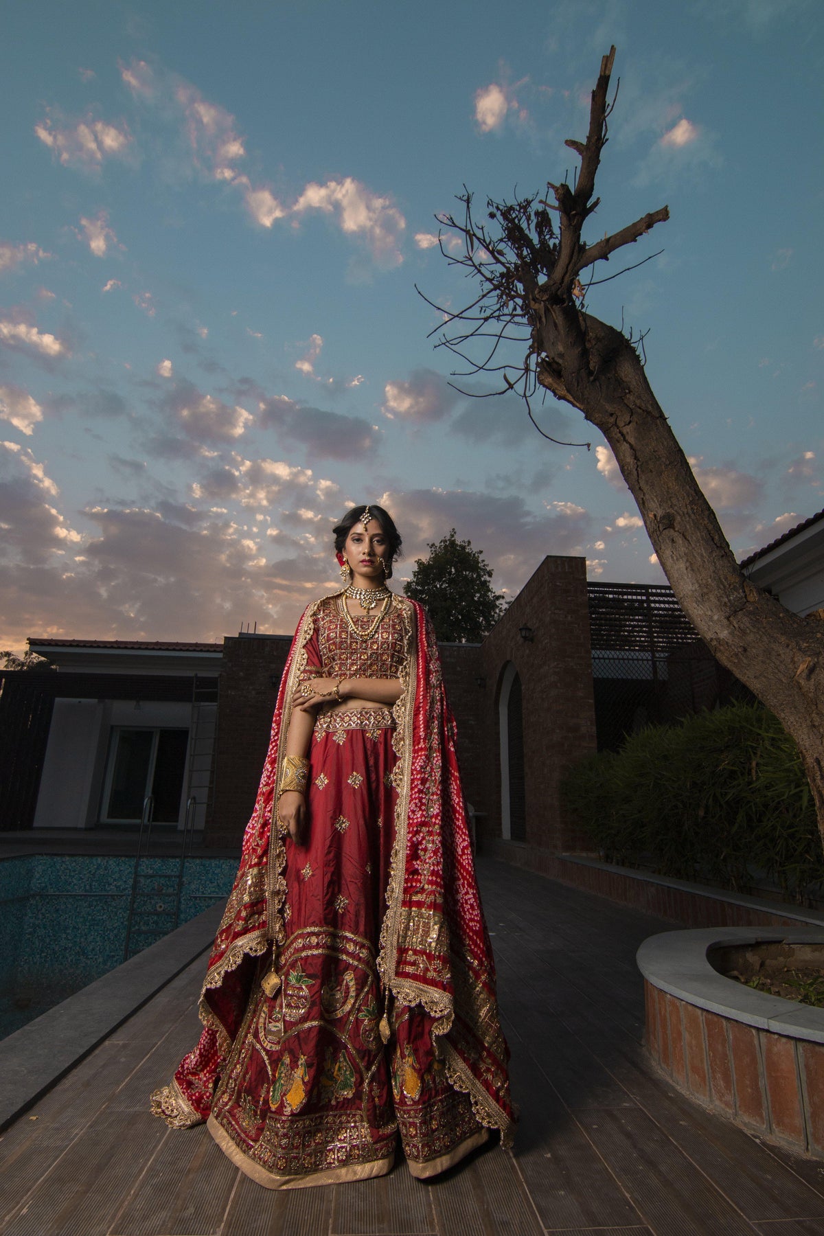 Make a show stopping entry in this stunning red pure silk bridal lehenga choli done up all over the ensemble in gorgeous zari, kundan & stone embellishments for a classic afterglow! This lehenga choli set is accompanied with matching dupatta with motifs.