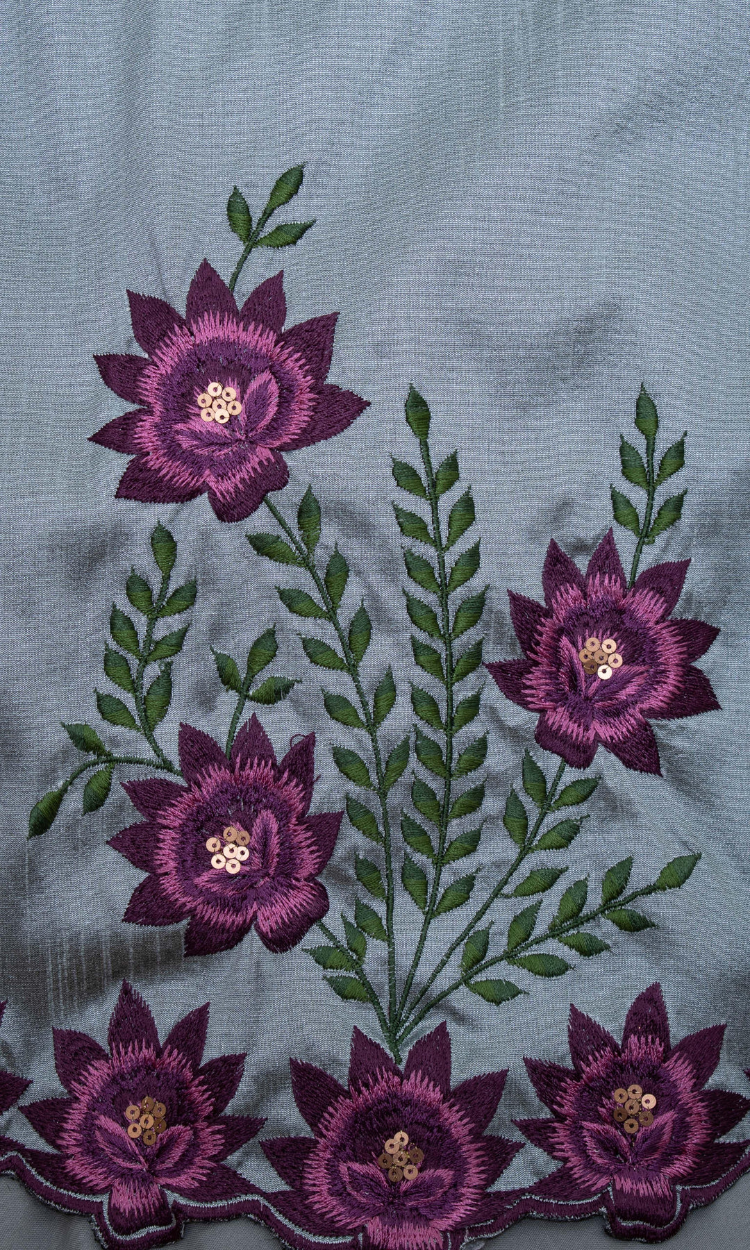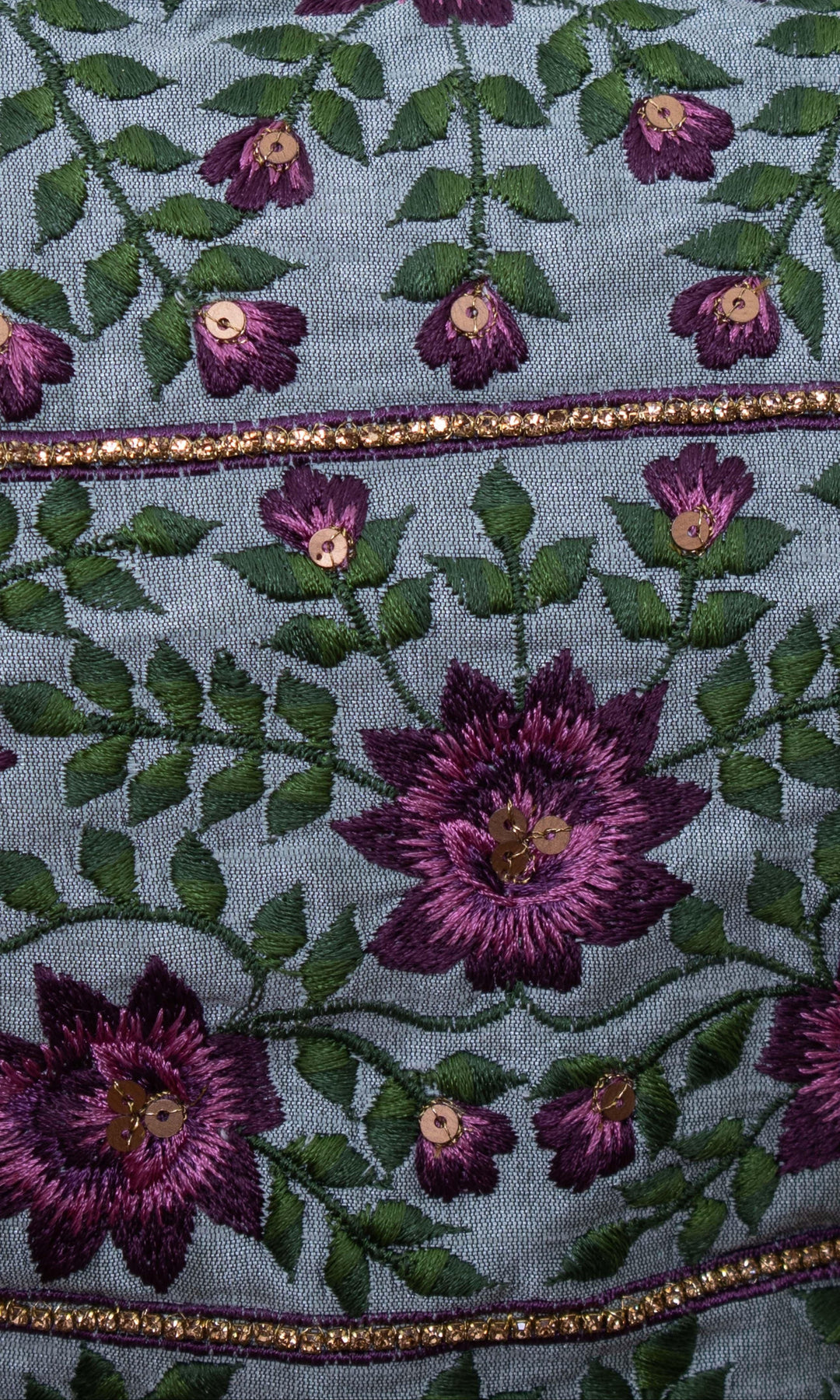 - Lehenga: Approximately 41" in length; thread, zari, & sequins work on hem