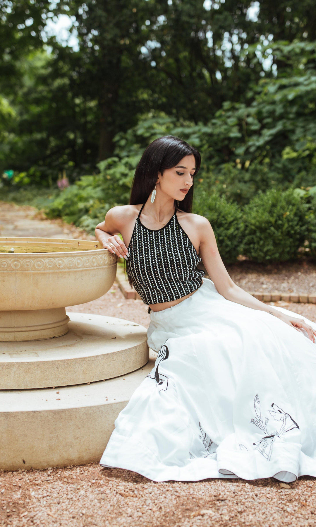 - Blouse: Sleeveless, fully lined, open back with string tie, heavily embroidered with mirror, cutdana, & resham work
