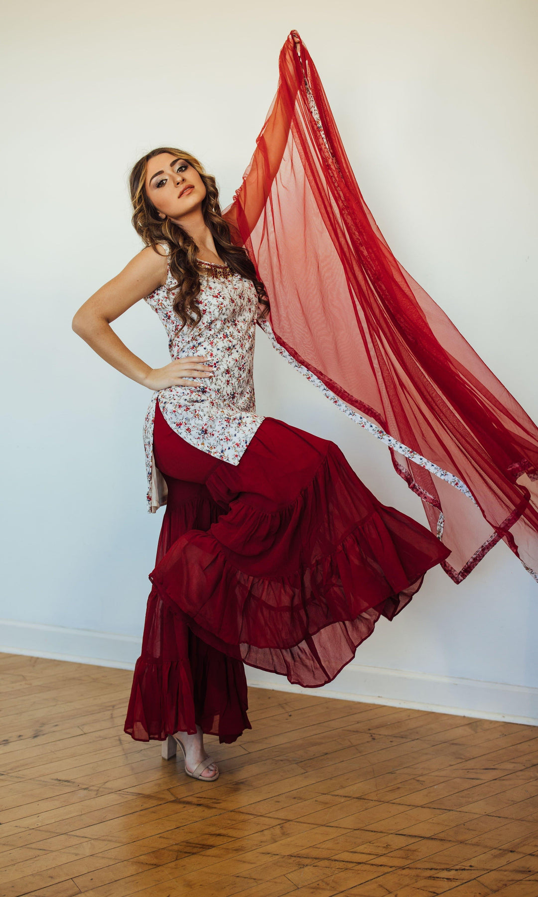 - Components: Top, Palazzo Pant, & Drape