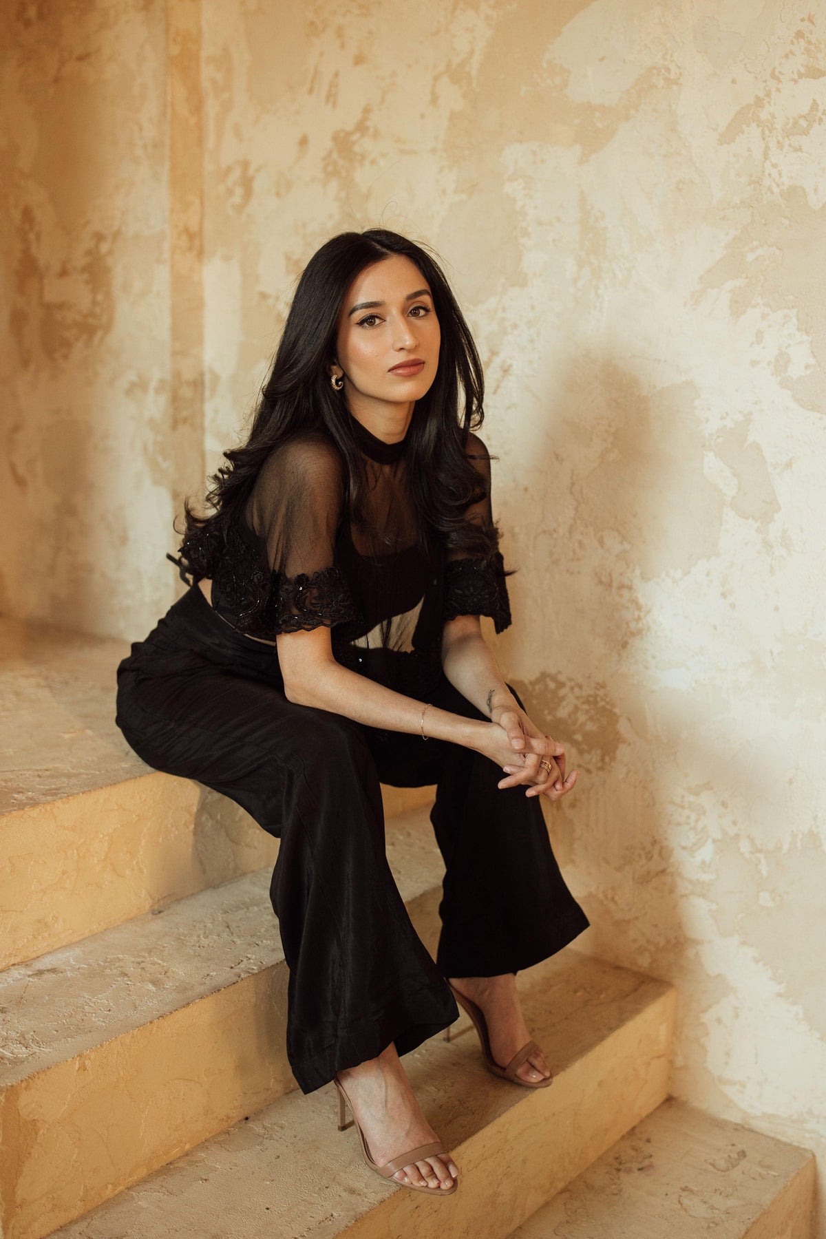 The elegant Kai Black Pant Set features a stunning chiffon drape cape, intricately embroidered with delicate resham work for a touch of refined artistry. Paired with a sleek black silk blouse and matching pants, this set exudes effortless sophistication.