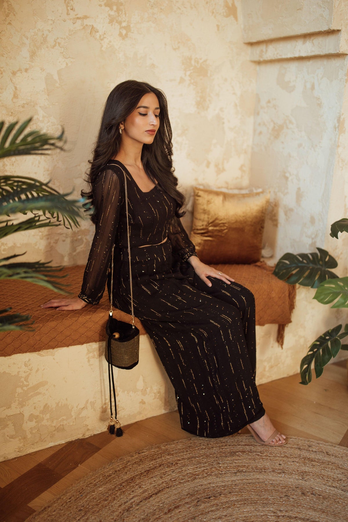 Crafted from georgette, the Martika Palazzo Suit exudes elegance with its classic black hue and intricate all-over golden weaving. The shimmering sequins embroidery adds just the right amount of sparkle, making the Martika Black & Gold Palazzo Suit a perfect blend of sophistication and understated glamour.