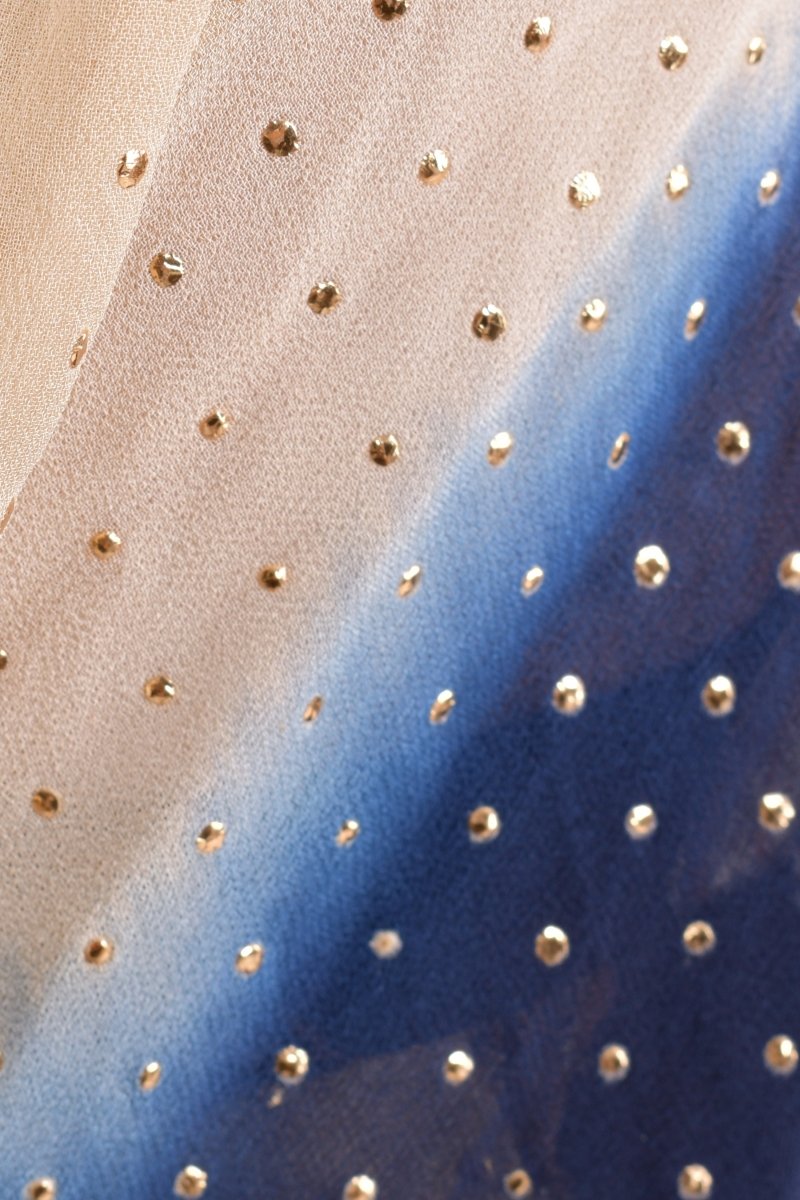 - Specifications: Pre-stitched drape, cascading ruffle detailing, golden floral motifs, mukaish work dupatta with ombré effect, heavy sequin embroidered blouse
