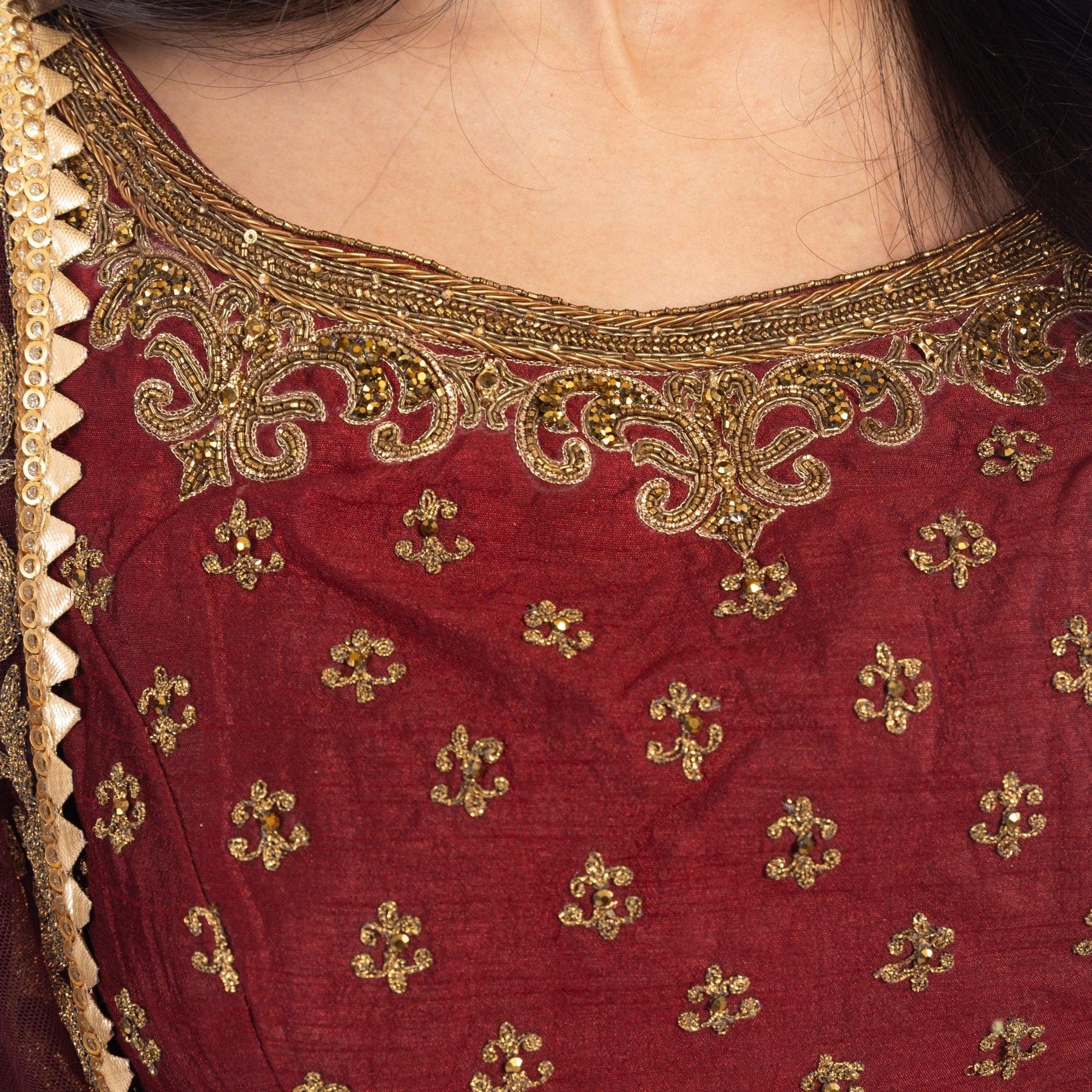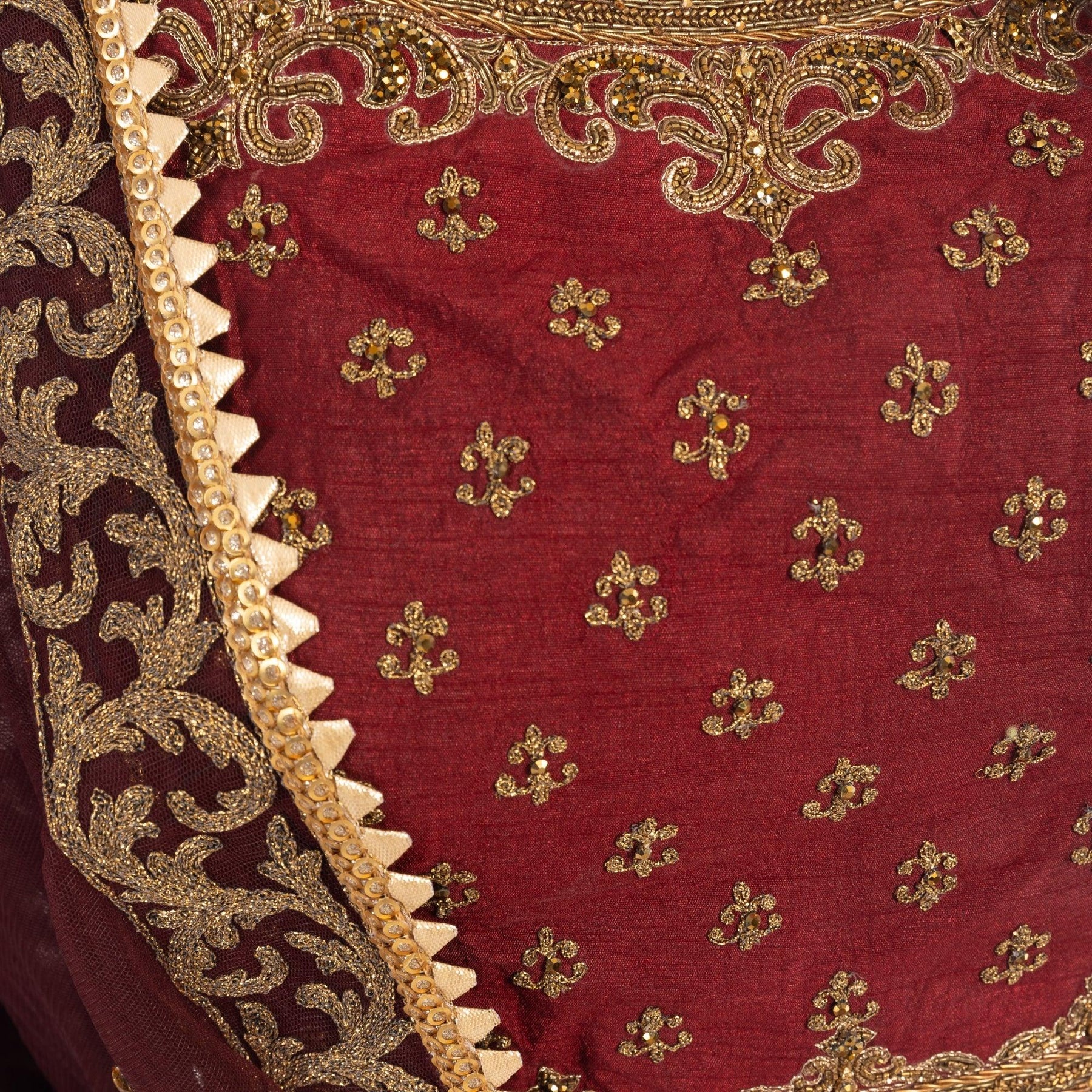If you are a diva who loves to turn heads wherever you go and this stunning pastel aqua green colored partywear lehenga choli. The lehenga is made of art silk fabric that has been enhanced with lovely heavy zari embroidery which makes this outfit perfect for any occasion. Comes along with maroon blouse and embroidered lace netted dupatta to complete the look.
