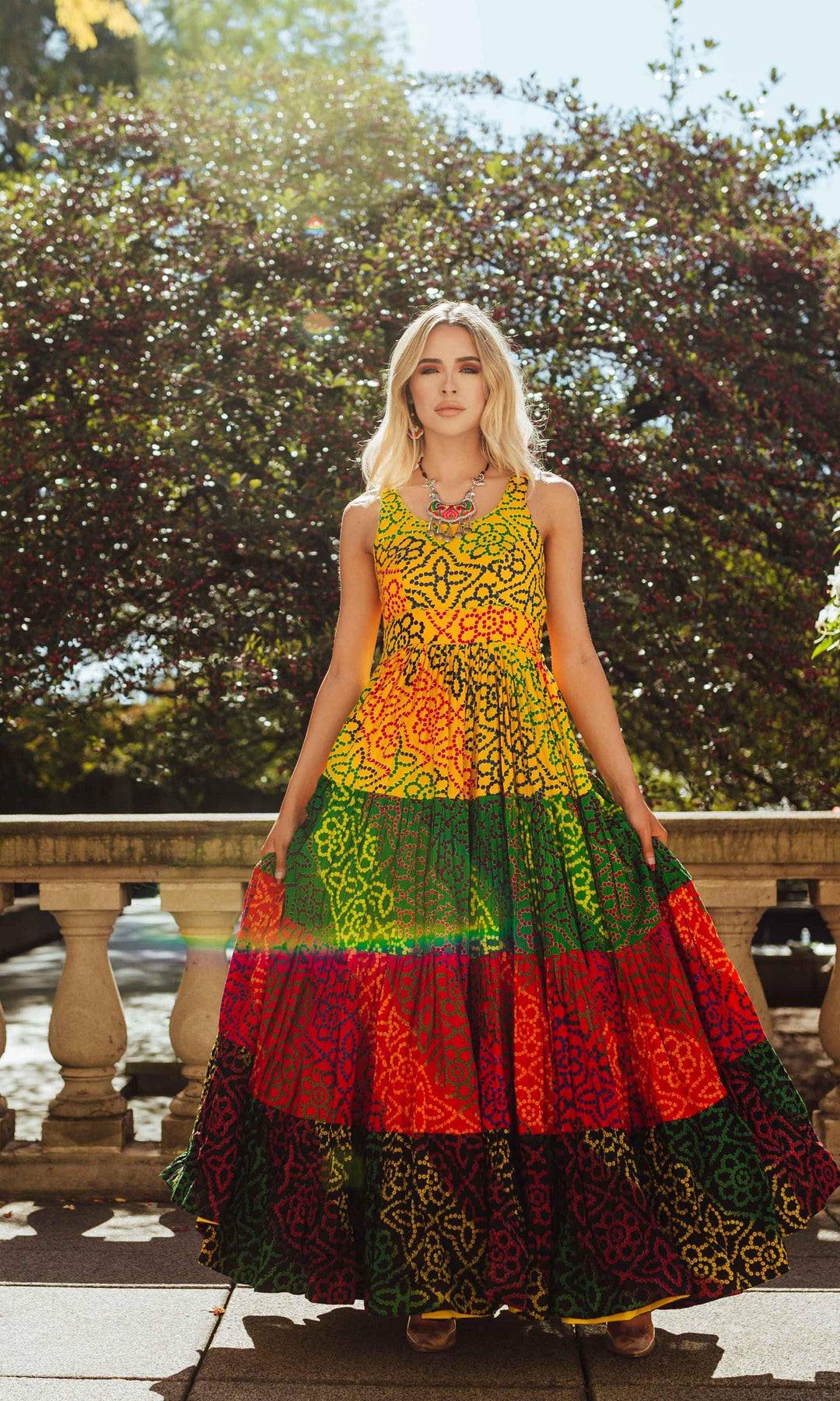 Awaken the diva within you and grab the spotlight with beautiful Bandhej maxi dress (about 40 meters flare) in our brand-new collection. Created using high-quality cotton with lively tropical colors and vibrant ethnic prints, these exciting Boho-inspired outfits are designed for maximum comfort.