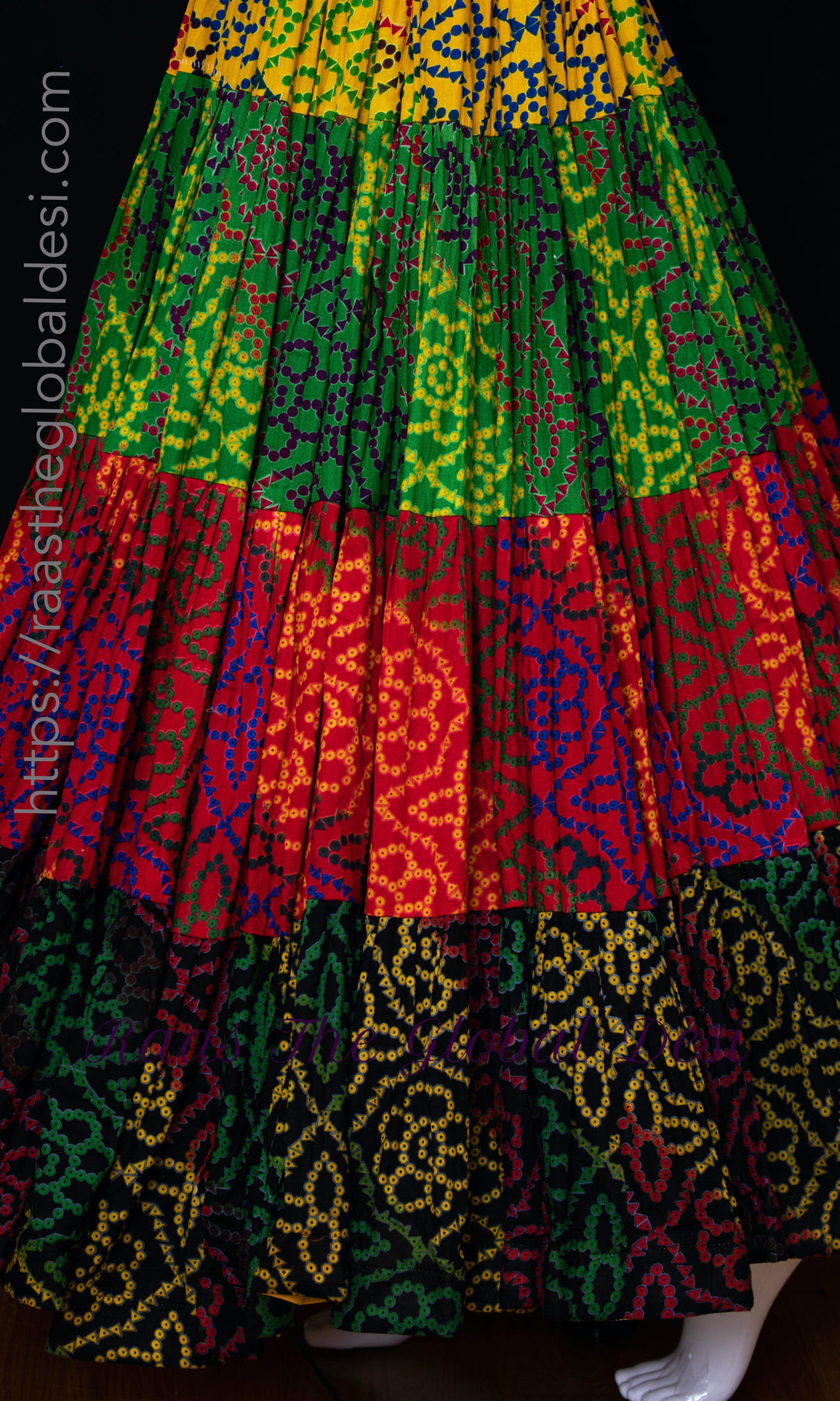 The highlight of each outfit is a tiered skirt in an alluring A-line silhouette. Cheerful tropical colors enhance the charm of each tier. Adding more excitement to the ravishing cotton skirt is a medley of traditional Bandhej prints with the finest attention to detail.