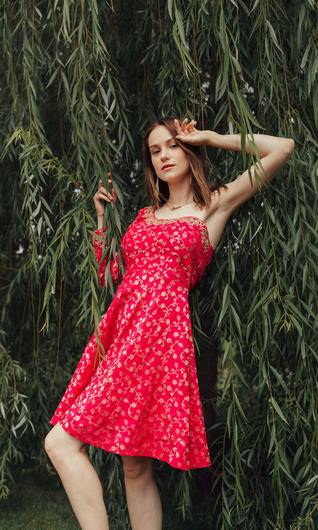 - Specifications: Fully lined, one shoulder, mini silhouette, all-over hand embroidery, back zipper
