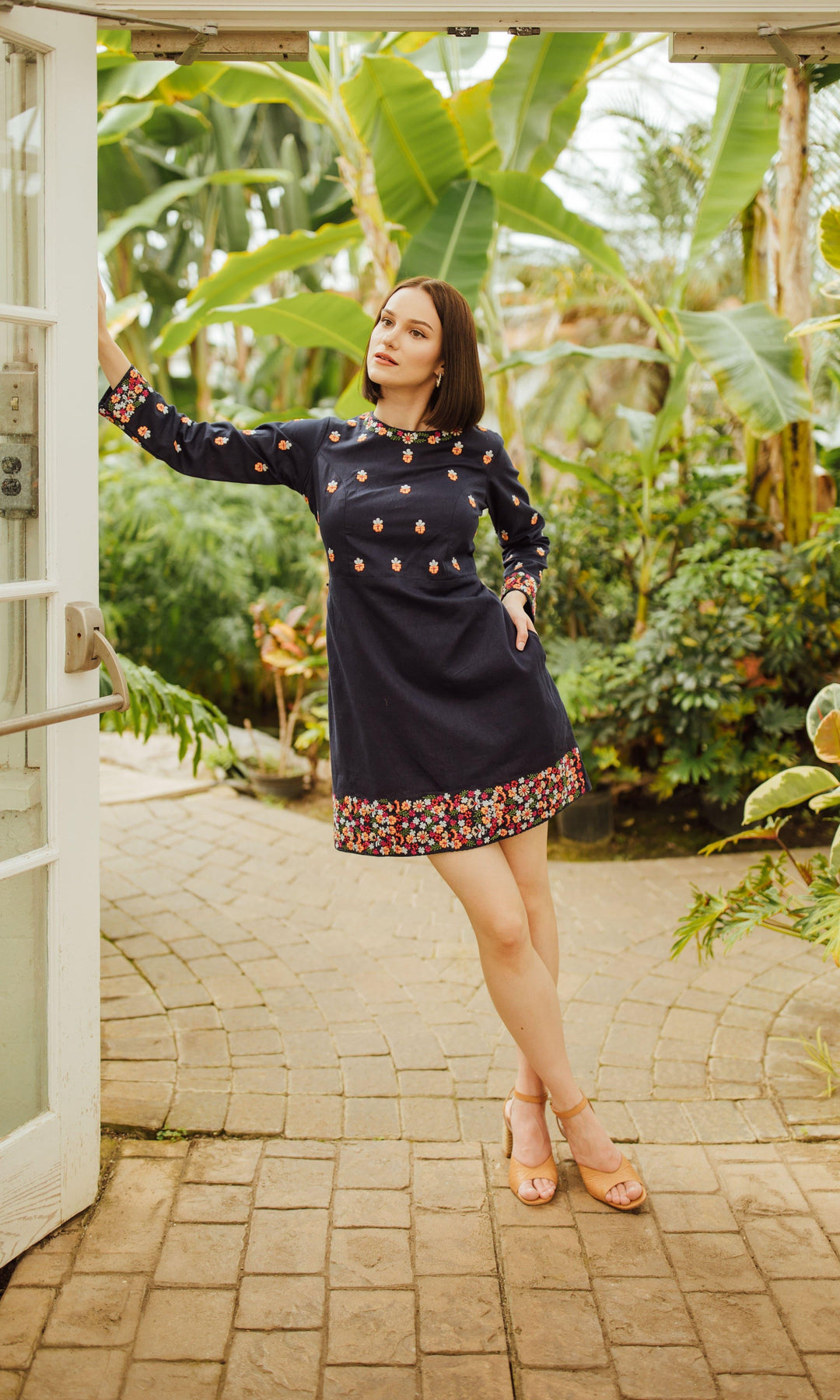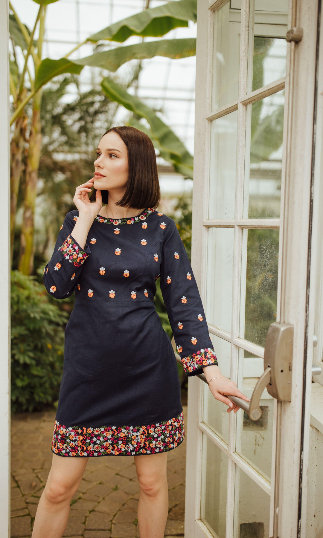 The Mabel Navy Mini Dress combines the elegance of navy cotton with intricate floral embroidery. Adorned on the neckline, sleeveless shoulders, torso, and hem, the embroidery adds a refined touch to this effortlessly stylish piece.