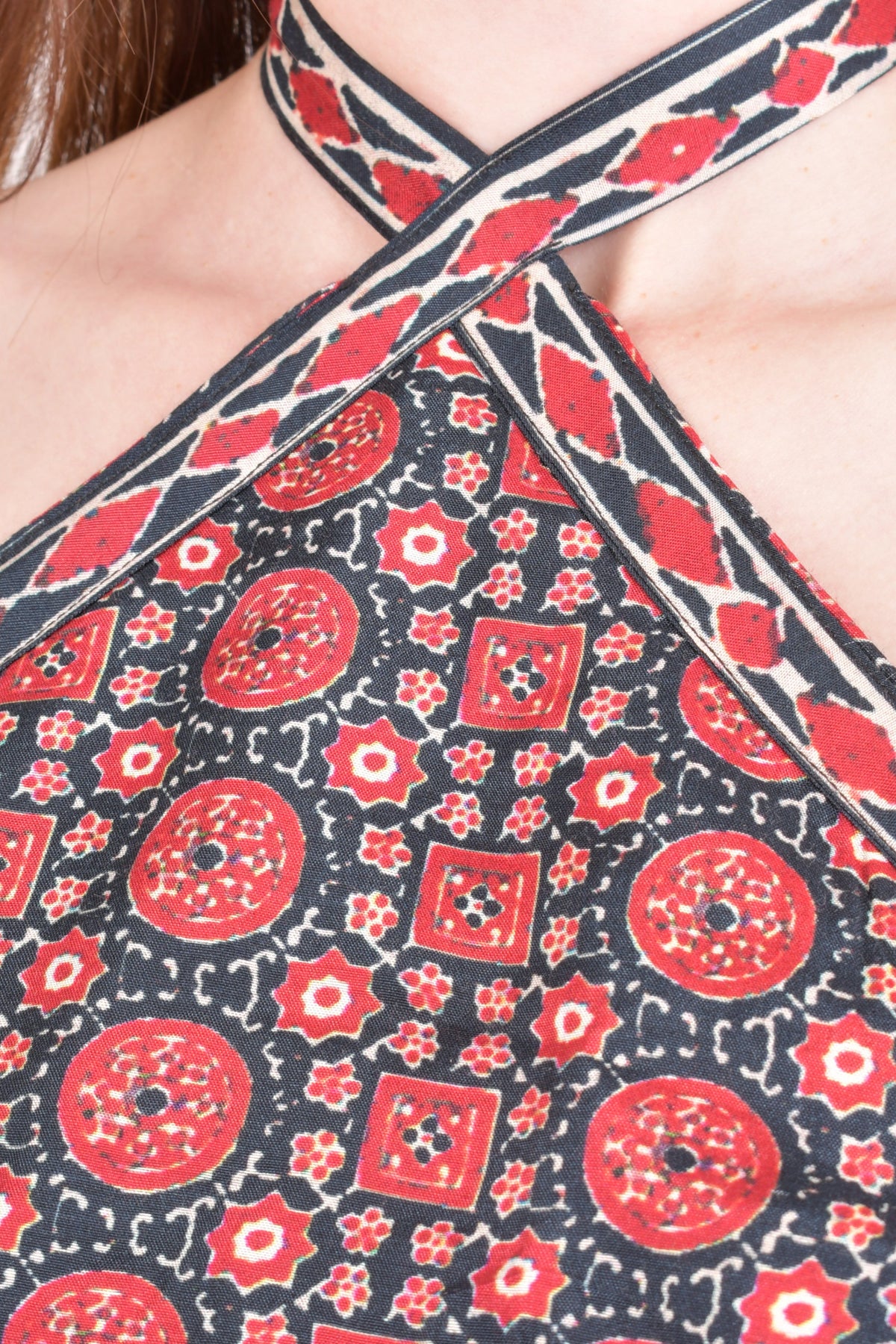 - Specifications: Fully lined, double slit, ajrakh print, halter, concealed back zipper